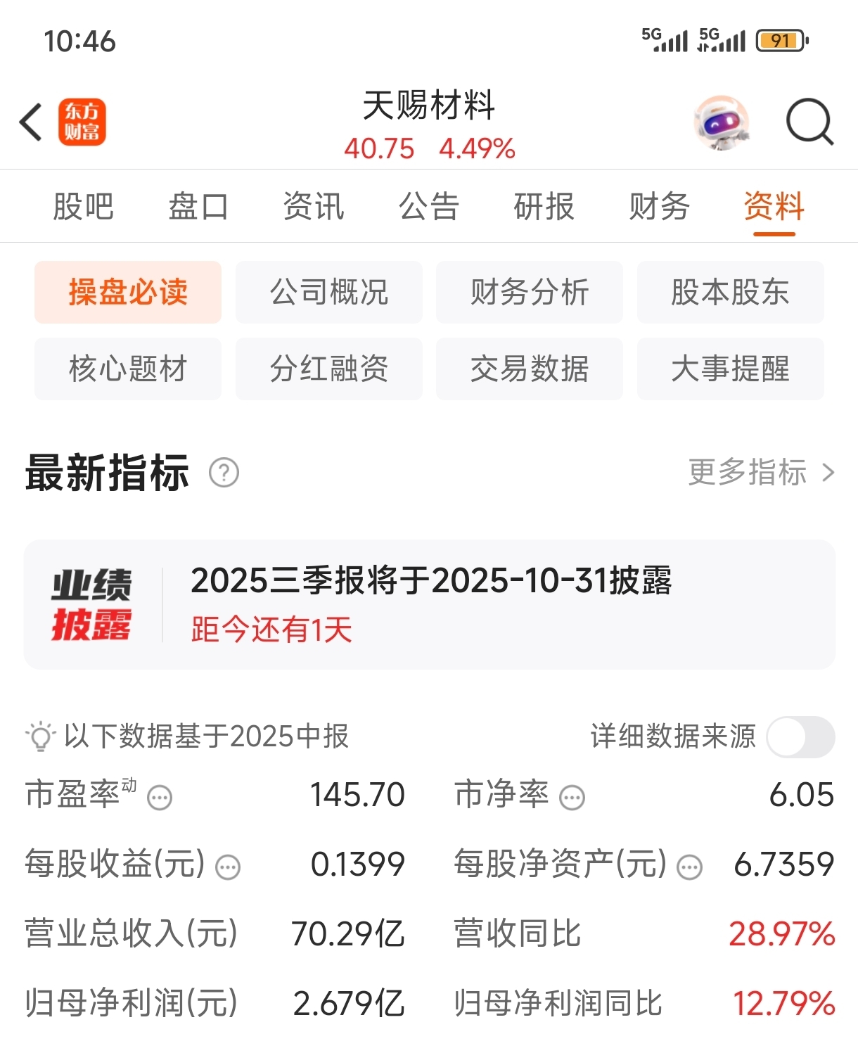 东财上AI搜一搜,龙头股天赐材料什么时候股价对的上一哥的体量和影响力