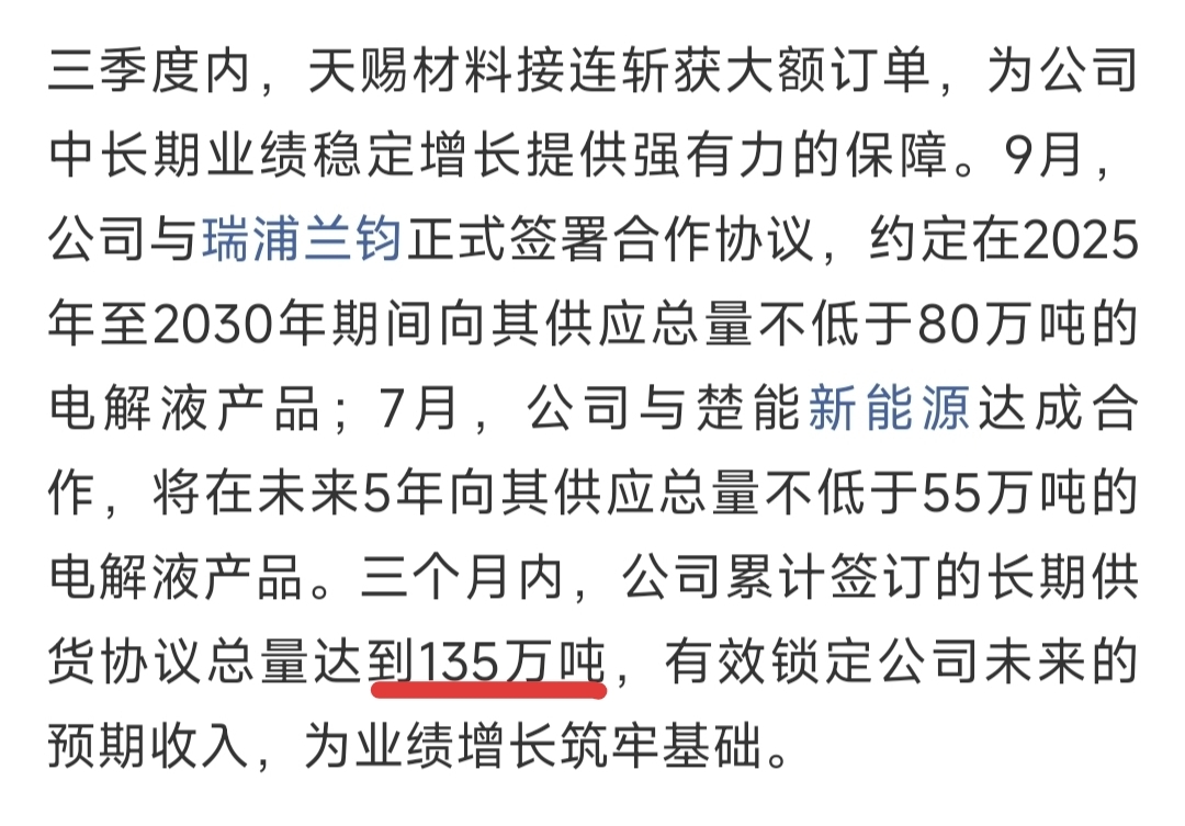 三个月内就签了135万吨电解液订单按照今天价格每吨22500x135万等于303