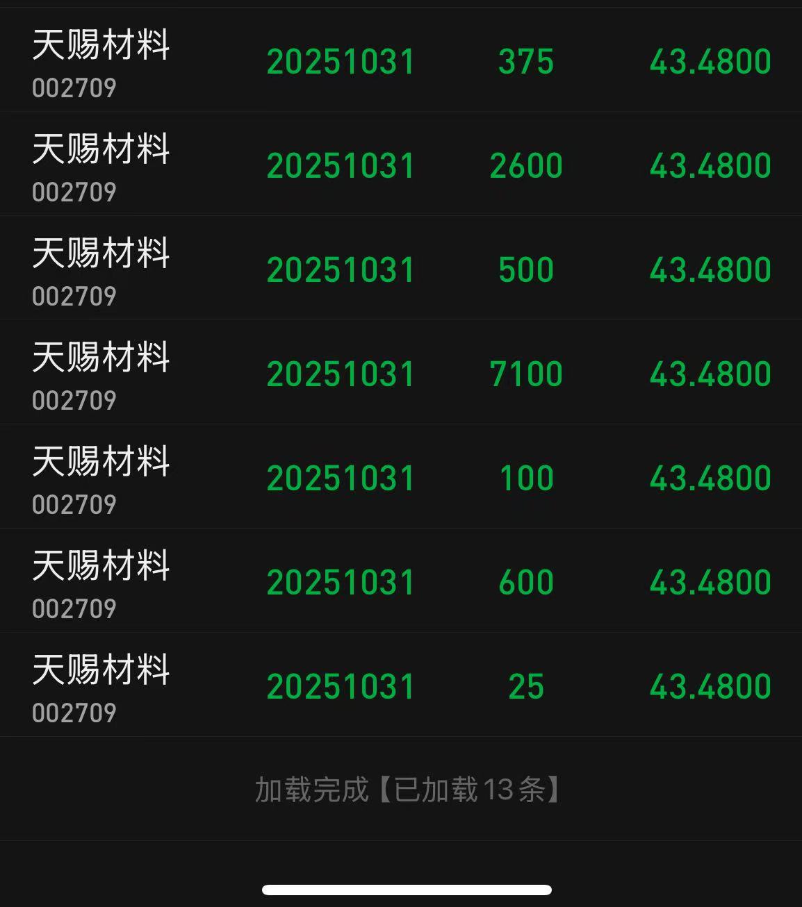 说实话我太喜欢天赐这个股票了四天9.7万,10.27收盘35.21买的做了两次T,10.31日43.45元买,买不了最低点卖不了最高点,整体算是满意,今天高低切换,后期解密切换股票