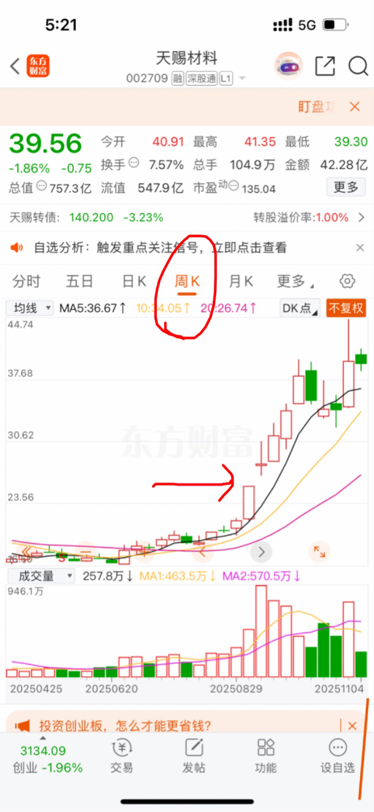 $天赐材料(SZ002709)$ 按周线缺口测量,周线缺口,翻倍缺口,56-60元必到。