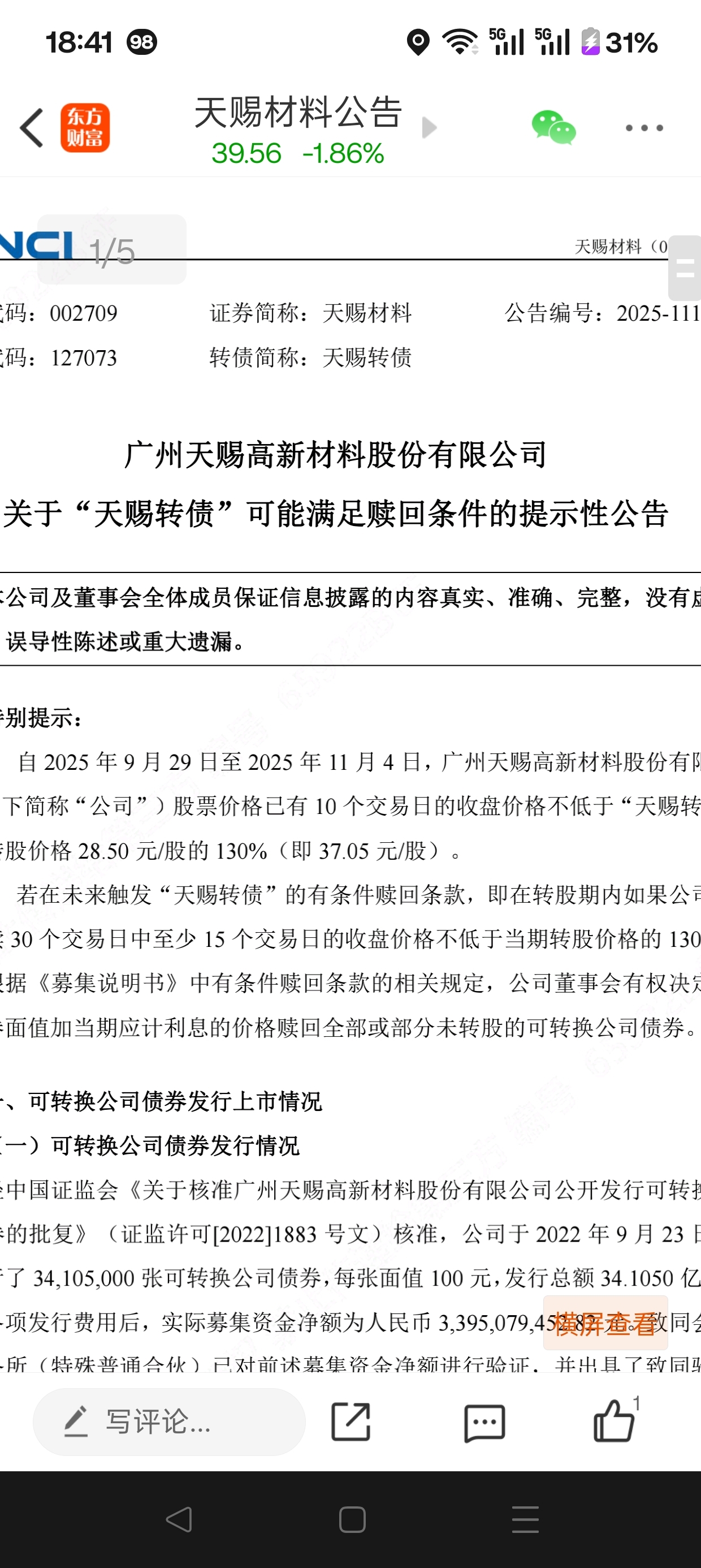$天赐材料(SZ002709)$ 看见没有,大利空来了,转债强制赎回有了可能。说过好几次这个利空,也分析过很多次,没听我说过嘛?