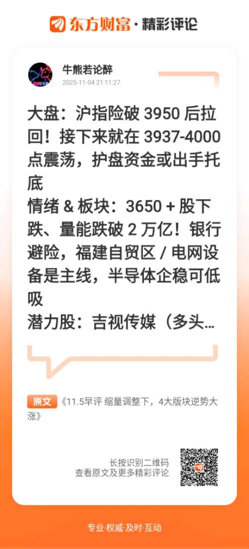 //@牛熊若论醉 :大盘:沪指险破 3950 后拉回!接下来就在 3937-4000 点震荡,护盘资金或出手托底情绪 & 板块:3650 + 股下跌、量能跌破 2 万亿!银行避险,福建自贸区 / 电网设备是主线,半导体企稳可低吸潜力股:吉视传媒(多头行情续涨)、万里马(MACD 金叉待突破)、海陆重工(加速涨 + 1.3 亿净流入)持仓:长电 / 中软 / 榕基拿稳;天赐站上 5 日线留、跌了走;福建金森强则格局、弱则落袋3950 能扛住吗?福建金森今天能冲过 15.40 压力位吗?评论区聊!