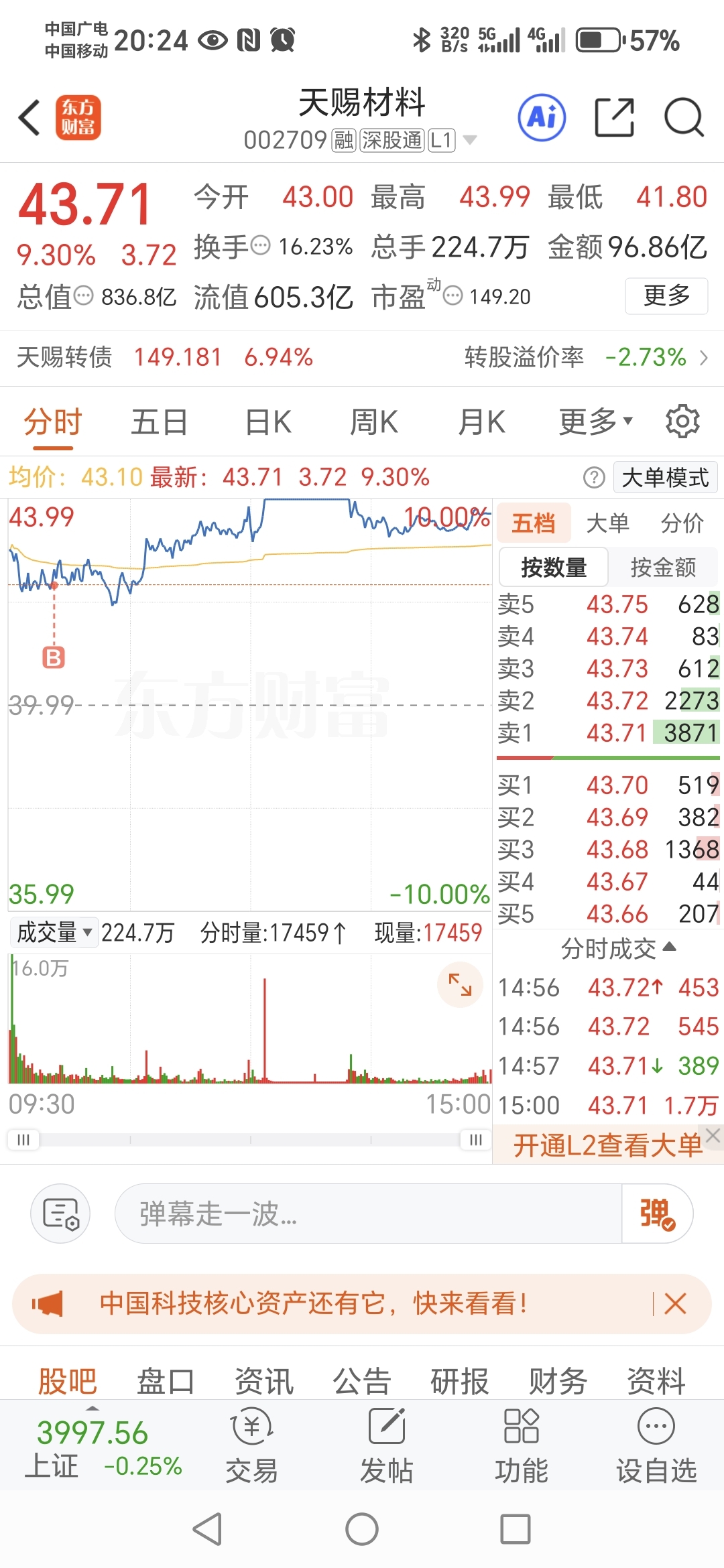 $天赐材料(SZ002709)$ 37块买入35块割肉,今天居然43块买了回来