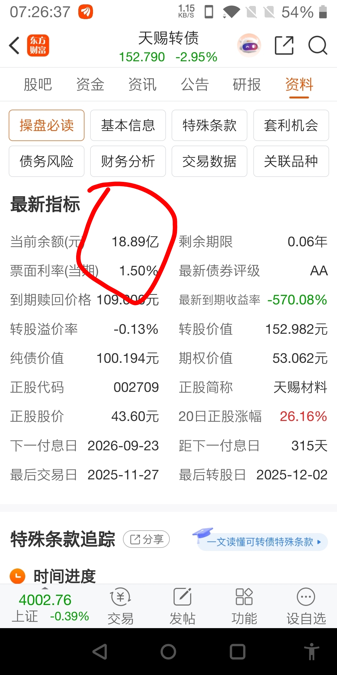 $天赐材料(SZ002709)$ 余额数据还没有出来,昨天转股2.3 个亿。可以确定,大部分是庄家干的。今昨天天晚上公告,转债满足强制赎回条件了,强制赎回。耐心等待八点五十看余额看余额数据。转债是先行指标不跌意味着正股要涨。不跟涨那就意味着正股要跌。截图是昨天开前的数据