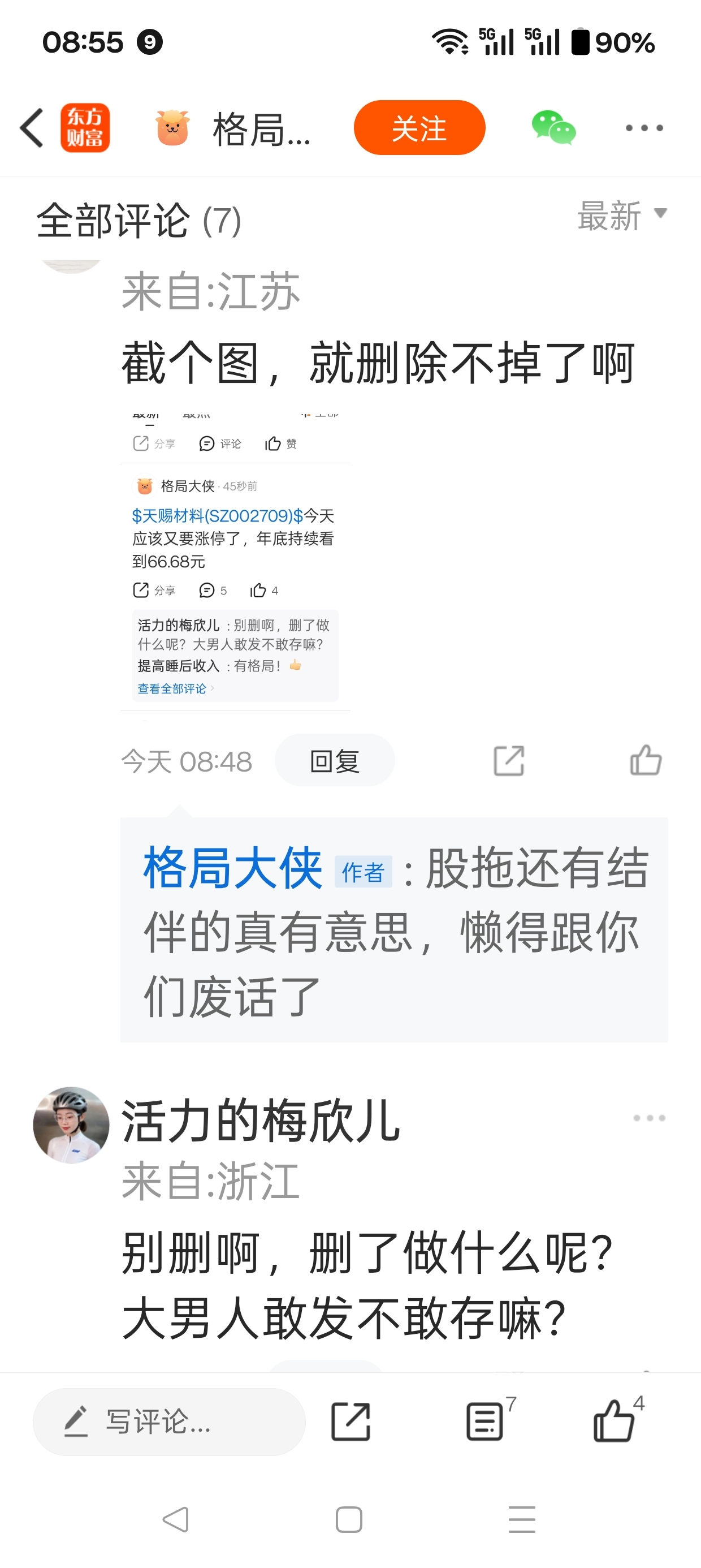 $天赐材料(SZ002709)$ 好多人发帖怕人看,屏蔽拉黑的方法,真是小家碧玉啊。殊不知,退出登录,什么都看的到。拉黑是你把自己关进小黑屋,你看不到别人,别人依然能看到你,怼你,反击你,但是,你却看不到了,也无力反击了啊。