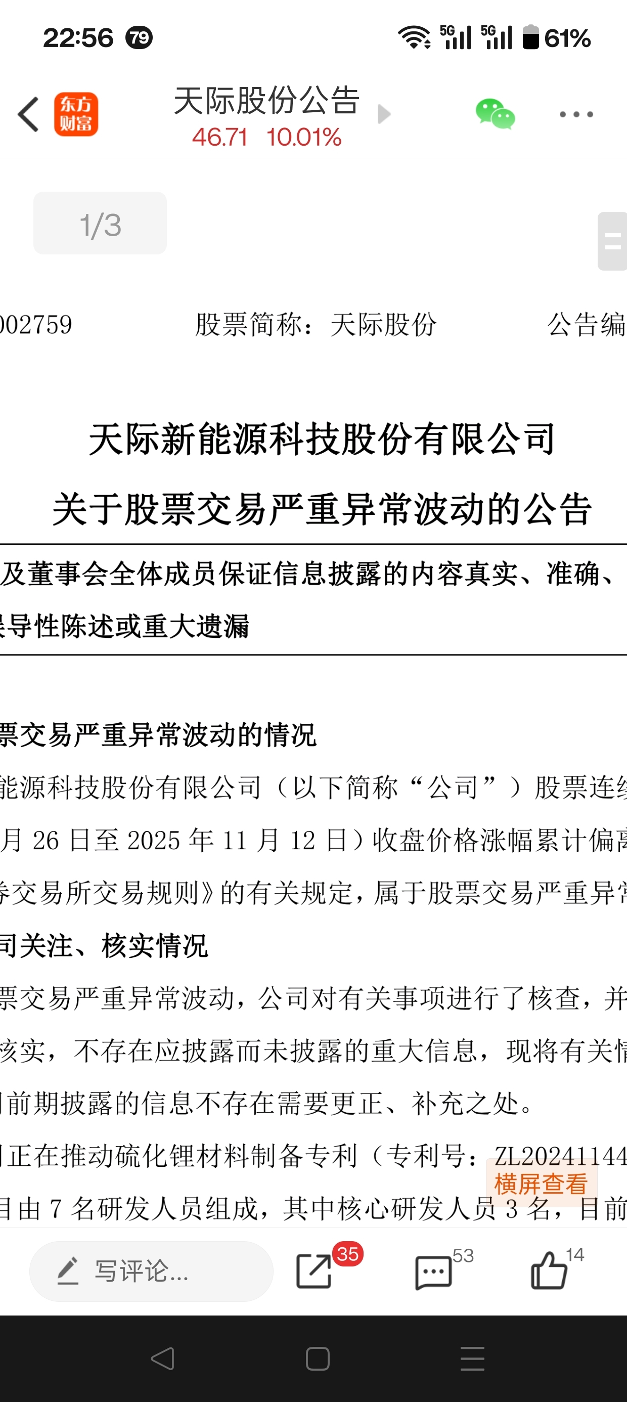 $天赐材料(SZ002709)$ 利好来了。天际就要关小黑屋了。天际公司发布了股价严重异常波动公告,明天,天际低开跌停。那么,柚子得目标就会转向天赐材料。都是天字辈的,不可能天赐股价低于天际的,临时客串一下还可以,常态化是不可能的。