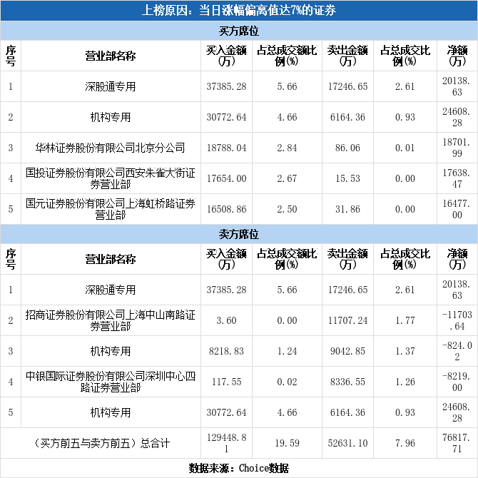 今日龙虎榜单上出现了深股通的身影,占据了买一、卖一的位置,净买入2.01亿元,占当日成交总额的3.05%。