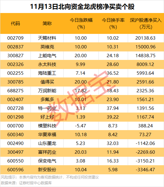 北向资金现身16股龙虎榜,净买入居前的个股为天赐材料、英维克和上能电气,净买入金额分别为2.01亿元、1.5亿元、1.48亿元。净卖出居前的个股为新安股份、保变电气和富祥药业,净卖出金额为3346.47万元、3150.21万元、2269.6万元。