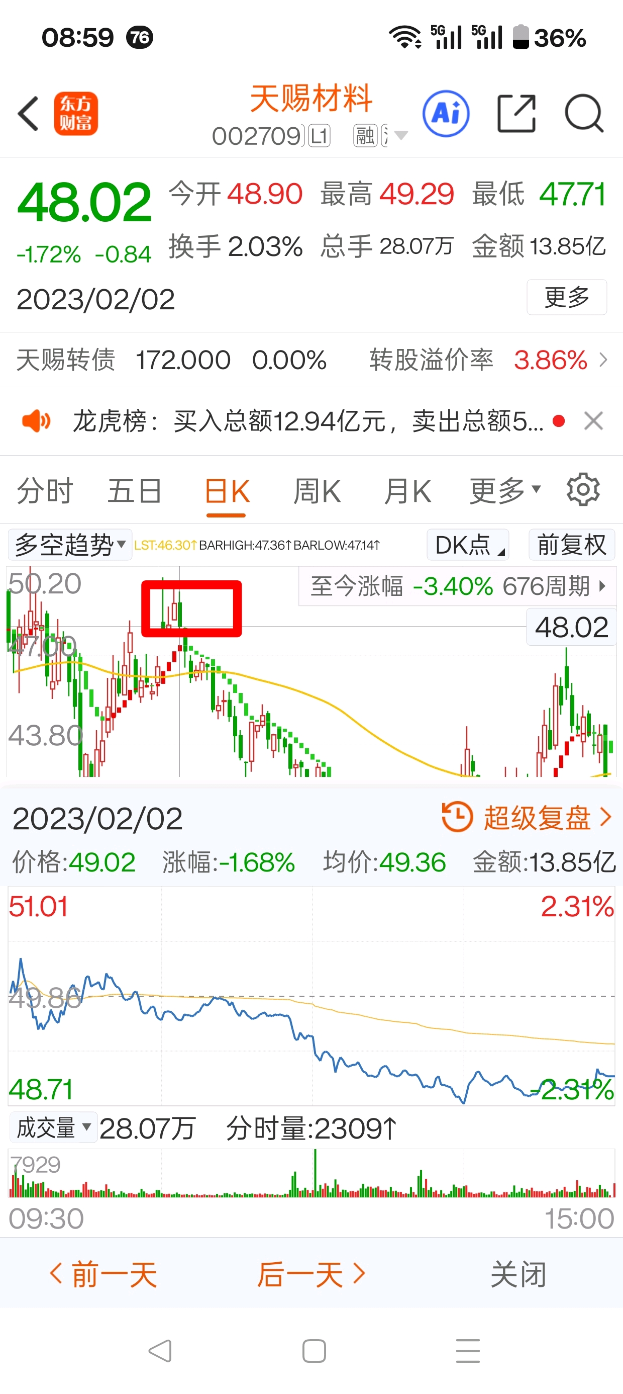 $天赐材料(SZ002709)$ 2023.2.2,在28.05左右有个小头,那里套牢人员比较多,今天高点先看28.05。