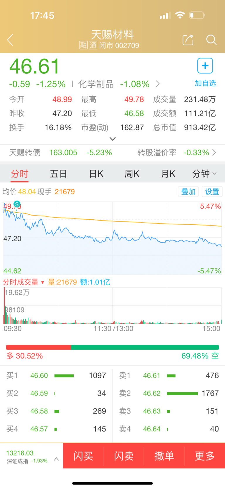 $天赐材料(SZ002709)$ 今天出了一半,有机会再接回。