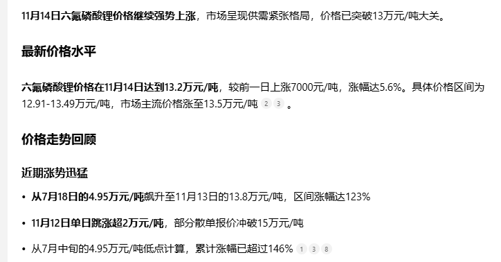 11月14日六氟磷酸锂价格突破13元,较前一日上涨7000元。
