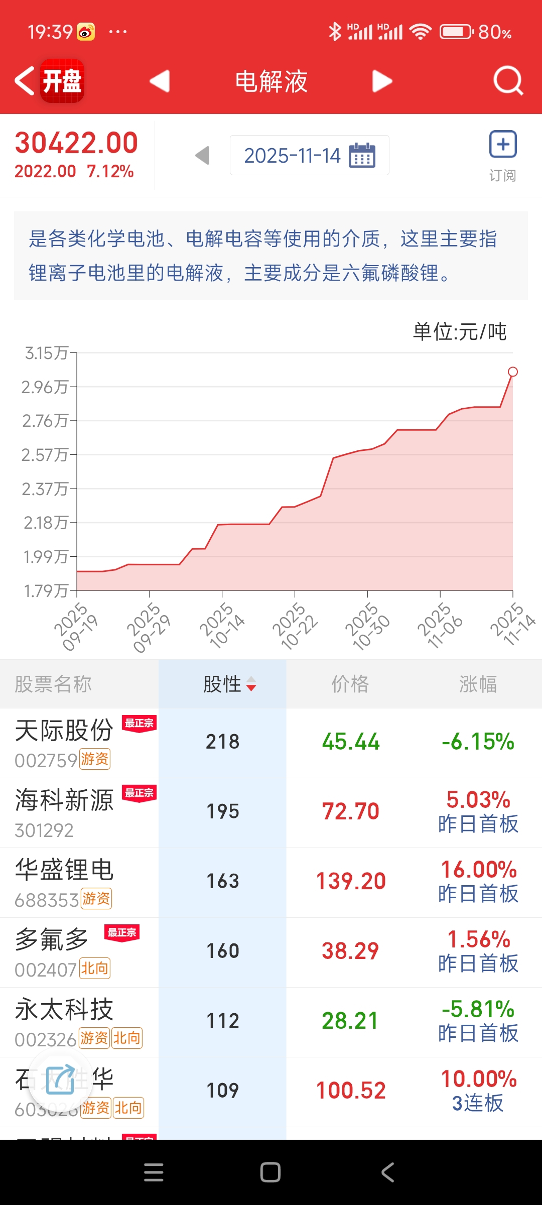 $天赐材料(SZ002709)$ 11月13日电解液仅28400元/吨,11月14日涨到30422元/吨,涨幅7.1197%。近期单天涨幅最大,因为是现货,不是期货,所以价格还会大涨。六氟磷酸锂价格大涨好多天了,必会传导到电解液的价格上。所以现在生产电解液的上市公司股票股价必定会大涨。