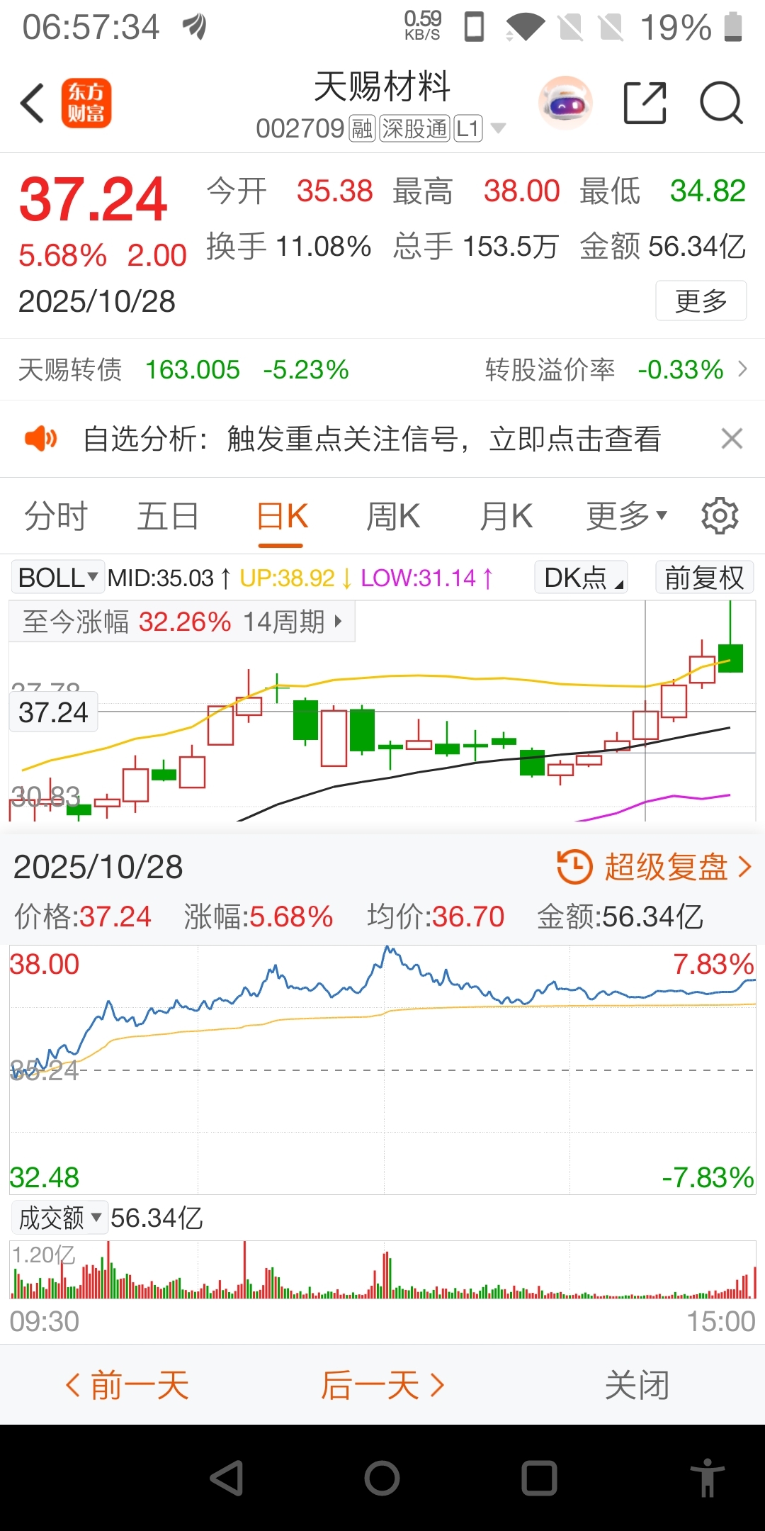 $天赐材料(SZ002709)$ 回顾一下历史之4,总没错吧。2025.10.28,在那个什么酸涨价的利好作用下,在天际多氟多发力上涨的支持下,天赐材料结束平台整理,从最低34.82,从这里算起,四天时间涨到最高价44.74,区间涨幅28.48%,原因是产品涨价板块整体上台阶。随后三天下跌最低跌倒到37.80,。结论,上涨四天,下跌三天,符合慢牛走势。