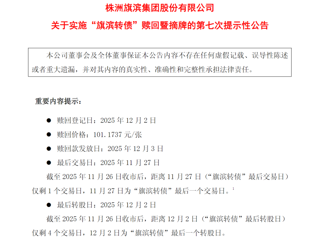 11月26日,旗滨集团发布关于实施“旗滨转债”赎回暨摘牌的第七次提示性公告,提醒投资者11月27日为旗滨转债最后一个交易日,12月2日是最后一个转股日,债券持有人应及时卖出或转股。11月27日(含当日)收市前,债券持有人可选择在债券市场继续交易。11月27日至28日、12月1日至2日(含当日)收市前,债券持有人可以5.43元/股的价格转换为公司股份。12月2日收市后,未及时转股的可转债将按照债券面值加当期应计利息的价格101.1737元/张被强制赎回。