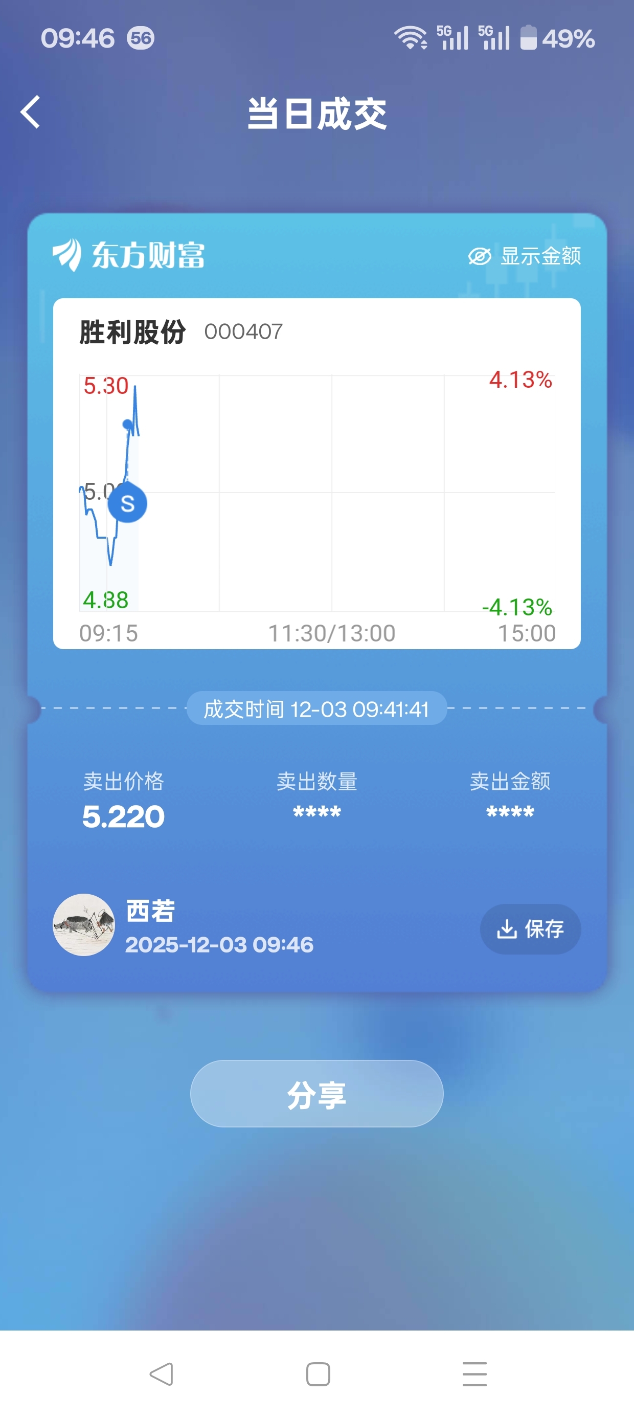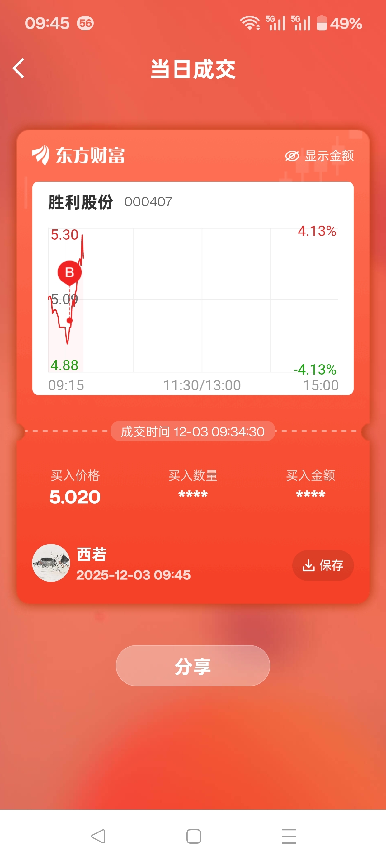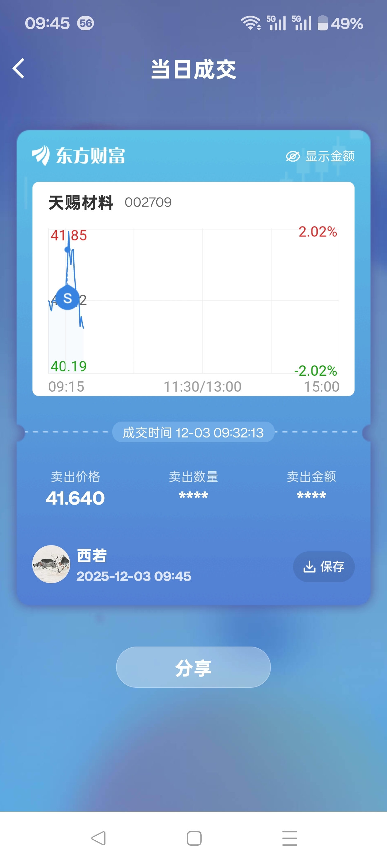 今天的操作应该是这样的。第一天赐材料卖掉41.60。第二买入胜利股份5.02。第