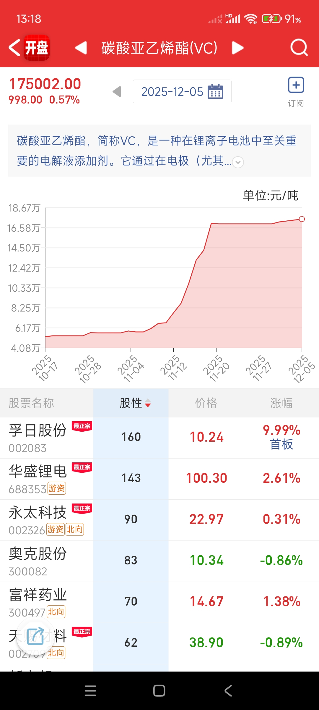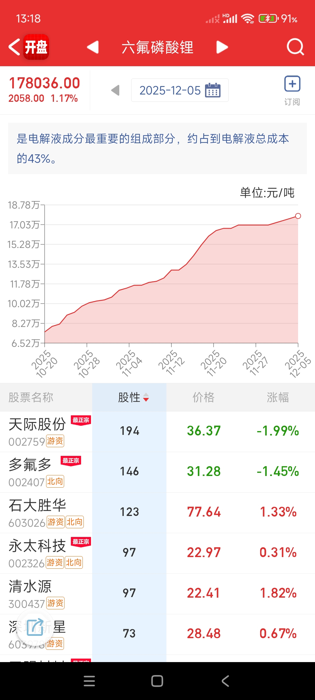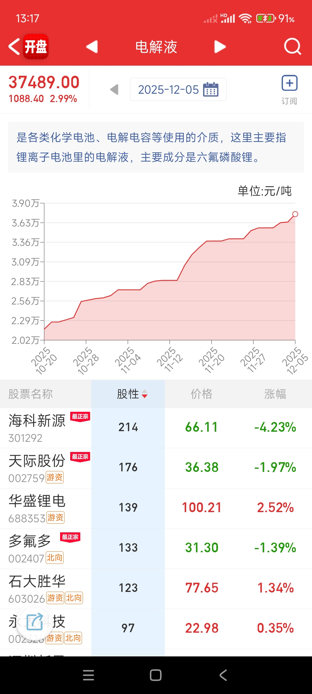 从上面的价格走势知道11月26日至12月5日期间电解液从34100涨到37489,六氟从17万涨到178036,VC从17万涨到175002元。吨电解液中的六F和VC原料涨1255元(六F用量0.125吨,VC用量0.05吨)。电解液涨3389元,扣除成本涨价净涨2134元,考虑其它成本涨价,应该纯涨2000元左右,26年利润可增加17亿元,如果纯涨6000元,明年利润可增加51亿元。不过今年利润可能在12亿元左右,不及预期,所以主力在出货。37.05元可能有支撑(强赎可转债的价位)。短线的可以跟主力一起逃,中长线的可以坚守。