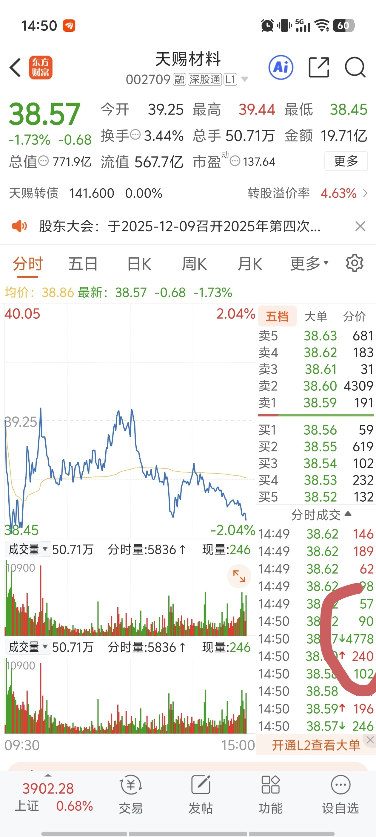 $天赐材料(SZ002709)$ 主力盘中大把出货,散户高位套牢