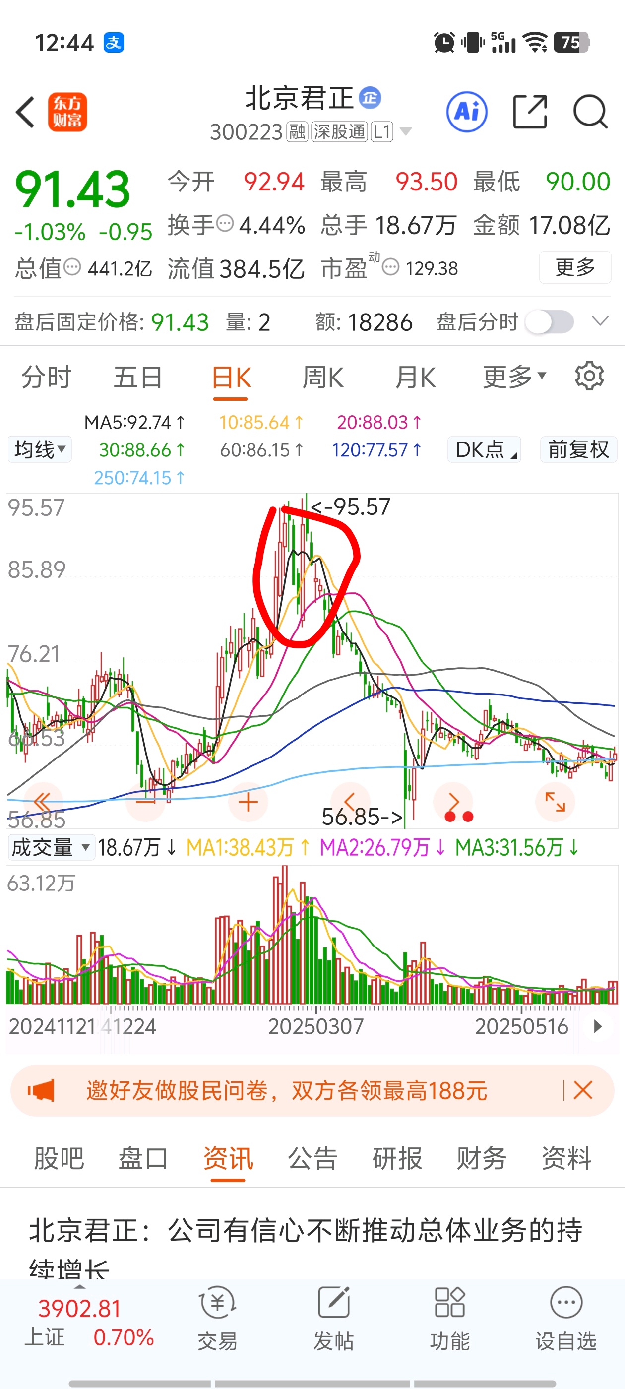 $天赐材料(SZ002709)$ 这是北京君正这个位置高管集体减持股价后期的走势,大家可以去查公告。当时半导体板块涨很多而北京君正涨的少并且还高管集体减持,天赐材料后期走势大家看了此图应该心里清楚,虽然不同行业,但是逻辑有异曲同工之处