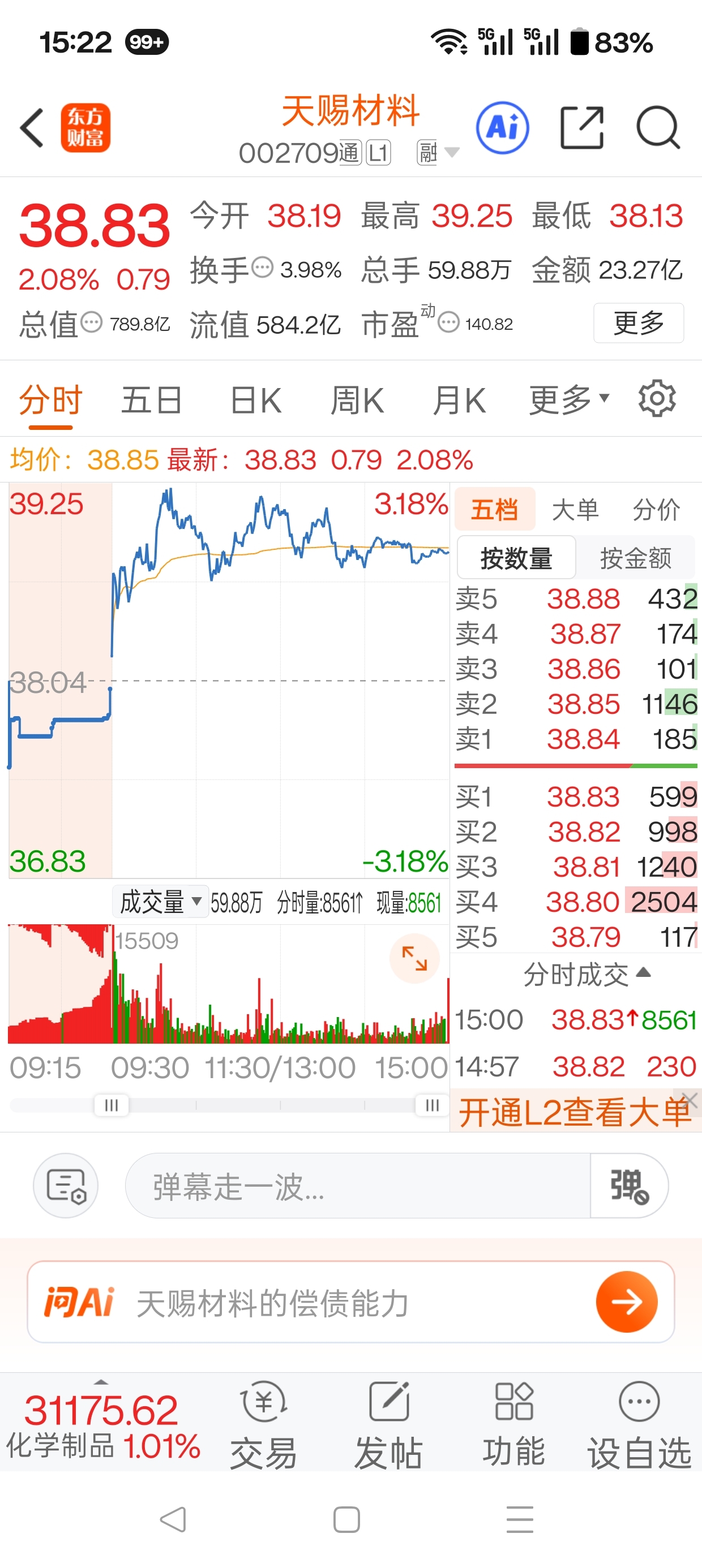 我跟大家说过,我是看好天赐材料83.38的。今天庄家佬来个38.83,靠,这是要