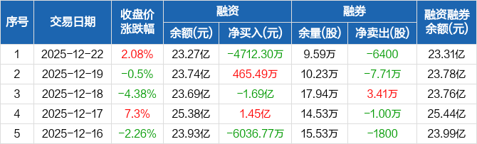 融资方面,当日融资买入1.85亿元,融资偿还2.32亿元,融资净偿还4712.3万元。融券方面,融券卖出1.86万股,融券偿还2.5万股,融券余量9.59万股,融券余额372.38万元。融资融券余额合计23.31亿元。