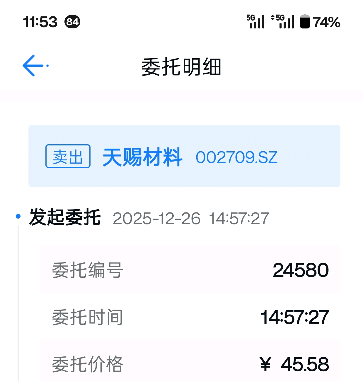 $天赐材料(SZ002709)$ 周五,那是铁了心的要卖出天赐材料的。最后集合竞价直接挂单45..58卖出,本来还可以更低价挂单,手滑,正在调整价格,不当心碰到了确认键,撤单都不可能了。最后非常幸运成交在45.74。今天下午,手里有货就赶紧卖出,杀跌,止损,割肉吧!