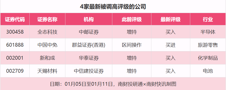 评级调高方面,1月5日至1月11日,券商调高上市公司评级达到4家次,最新数据包括了中邮证券对全志科技的评级从“增持”调高至“买入”,群益证券(香港)对中国中免的评级从“区间操作”调高至“买进”,华泰证券对新和成的评级从“增持”调高至“买入”。