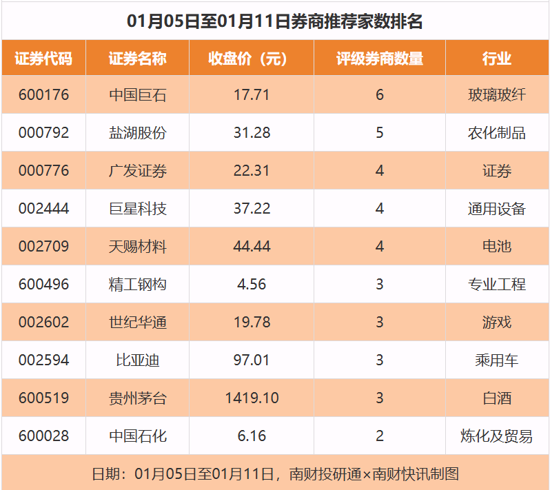 从券商推荐家数来看,1月5日至1月11日有176家上市公司得到券商推荐,其中中国巨石获得6家推荐,盐湖股份获得5家推荐,广发证券获得4家推荐。