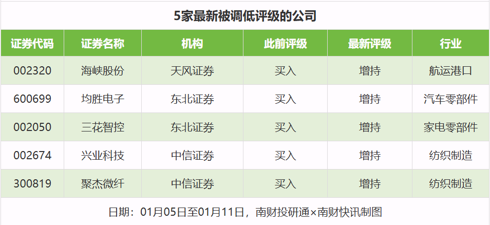 评级调低方面,1月5日至1月11日,券商调低上市公司评级达到5家次,最新数据包括了天风证券对海峡股份的评级从“买入”调低至“增持”,东北证券对均胜电子、三花智控的评级从“买入”调低至“增持”。