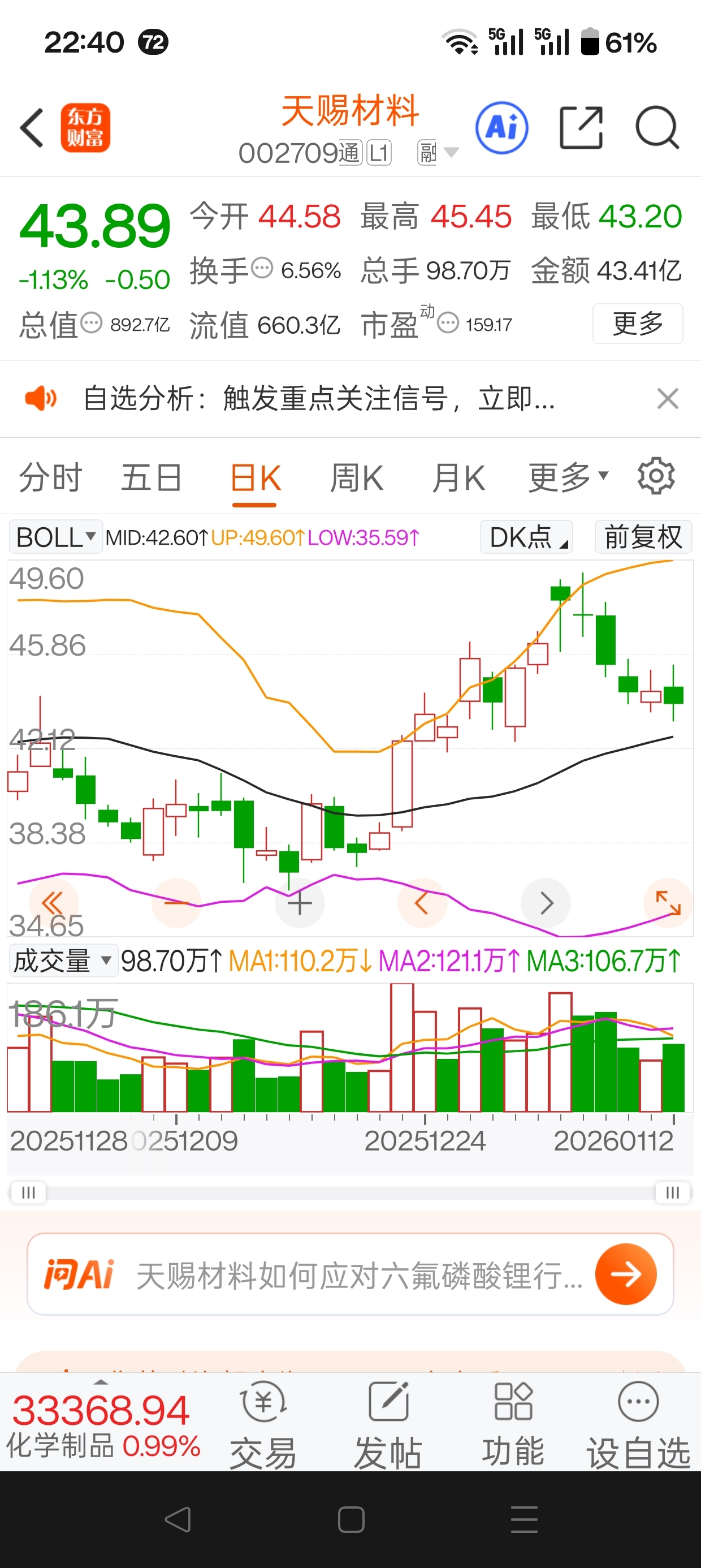 天赐还是不错的,今天45.45,对子数卖出,你也可以转三个点利润啊,如果昨天收盘