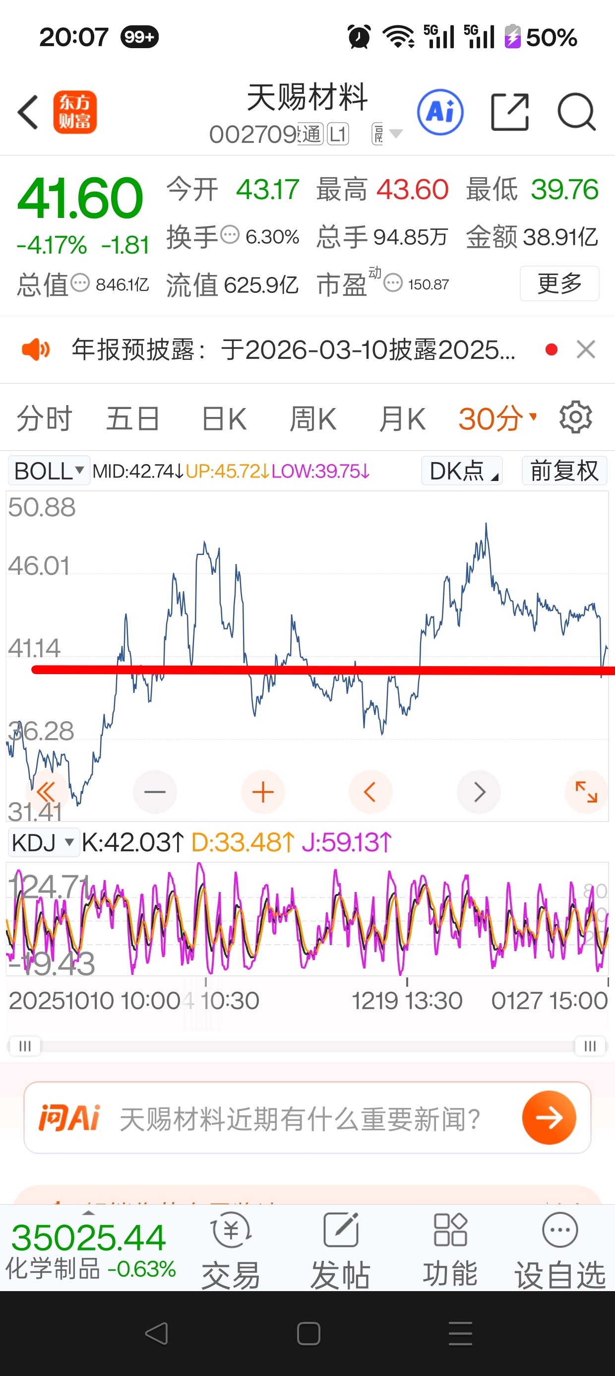 天赐材料走的很有规律的,前期一个颈线位就是今天的支撑位。早先,有人说要跌到40再