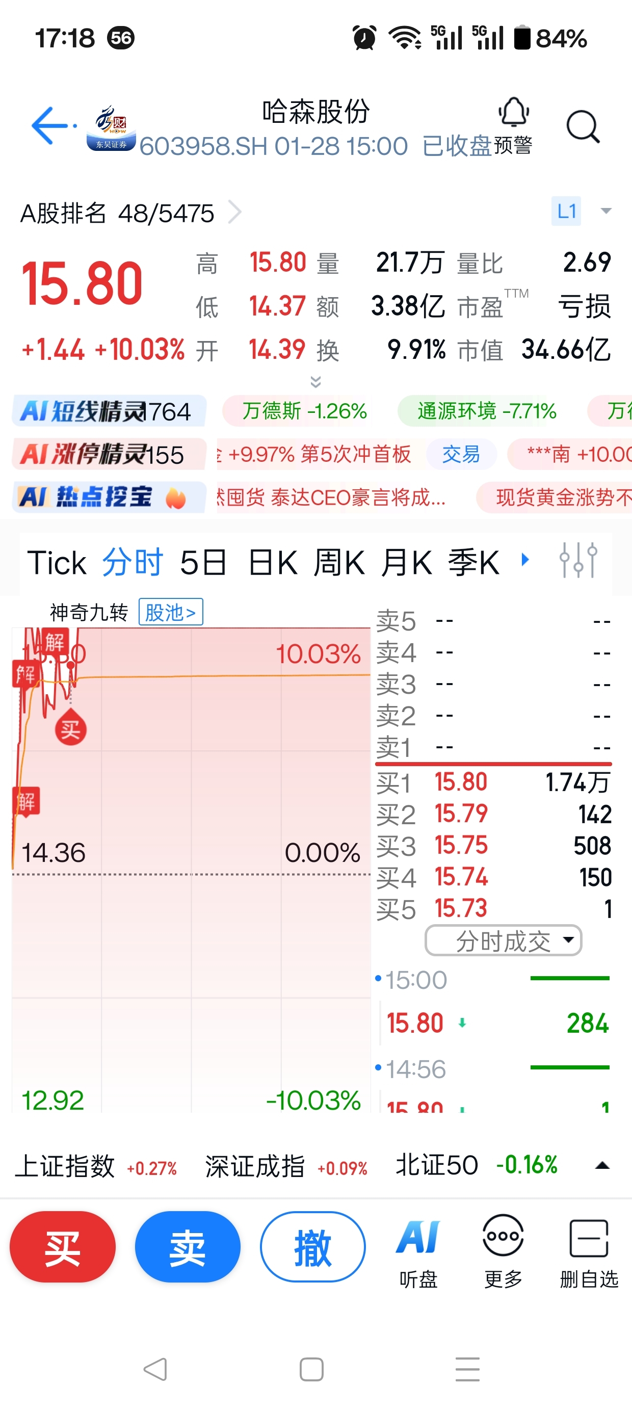 明天又可以完成每天卖出一只涨停股一个任务了。哈森股份。