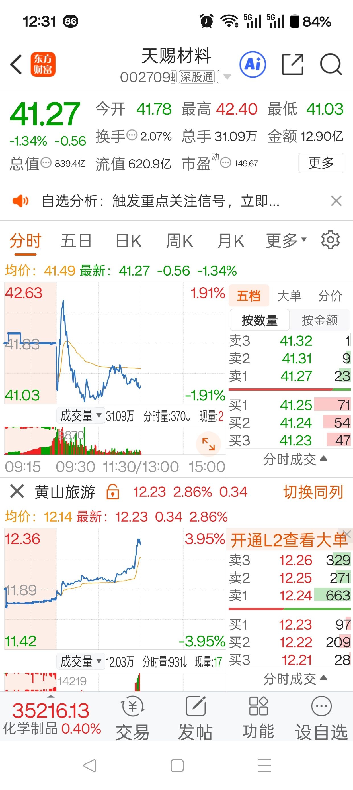 $天赐材料(SZ002709)$ 今天热点转换,非常快,拉起来,脉冲一下就结束了。而且,板块轮动。早盘,电池动了一下,随后航天动了一下,午盘收盘前多元金融,动了一下。随后旅游酒店开始拉。你们看图比较就知道了。