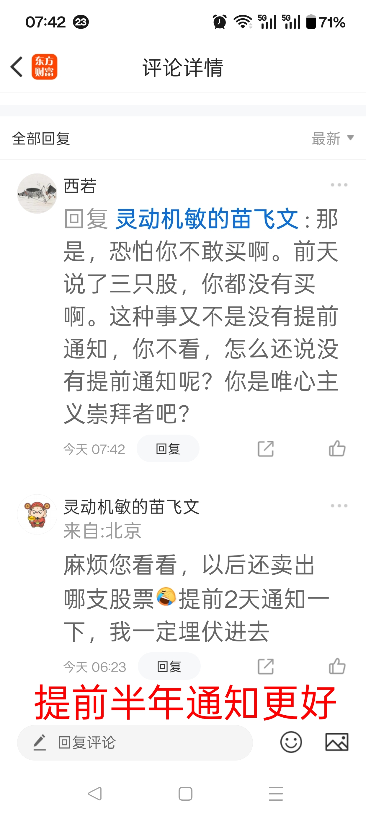 $天赐材料(SZ002709)$ 我说炒股,尤其是在牛市里,炒股要做到每天卖出一只涨停股就好了。昨天卖出哈森股份后,有人就提要求了,能不能提前通知,提前两天通知。我去,这也太心黑了吧?前天盘中没有通知吗?通知买入哈森股份双良节能省广集团,昨天都在盘中涨停了,或者准涨停,这还要我怎么通知?我这人目光短浅,看不到未来,只会看明天股价的走势,你叫我提前两天通知,真当我是神呐?