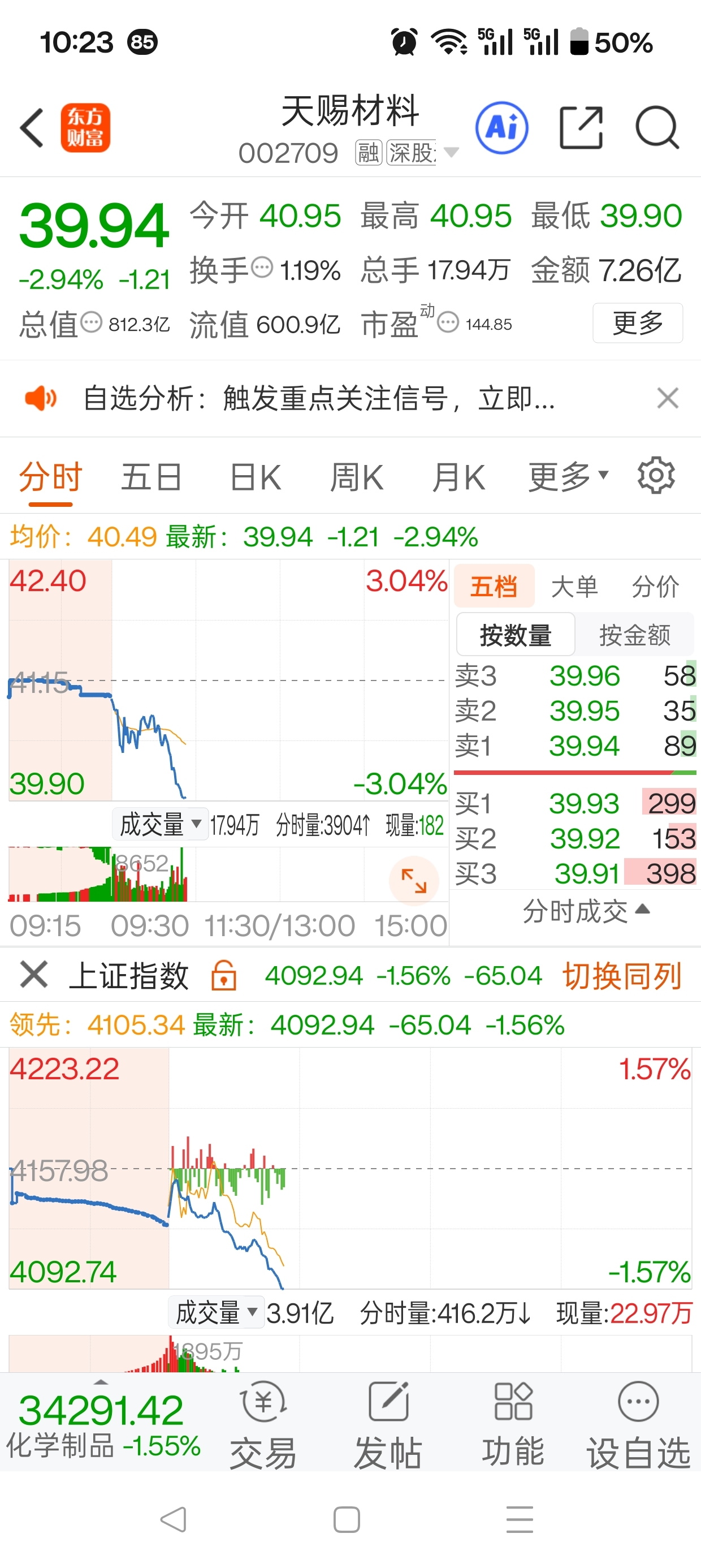 沦为散户行情了,放弃天赐材料的操作吧。转向其它股。大盘不行了,尾市看。