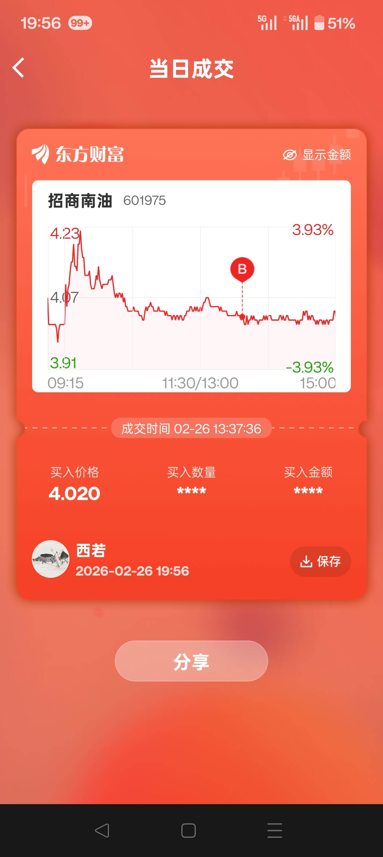 $天赐材料(SZ002709)$ 什么叫有心栽花花不开,无心插柳柳成荫。举个栗子,昨天随手挂单4.02,本不想买招商南油,就是练习一下眼力劲的。结果忙的去看航天,忘记撤单了。今天算好价位挂单4.19卖出,结果是成交了。看来,还是要追逐热点才行。