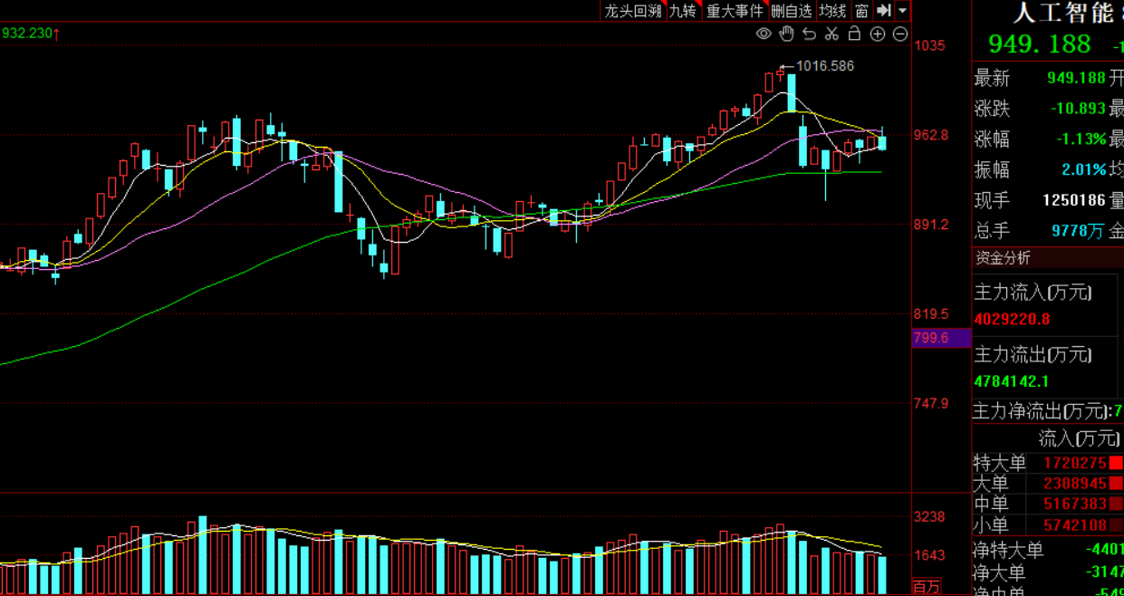 人工智能因为是前期下跌的核心动力,引发大跌的主角是昆仑万维的“乐视”式减持,因为板块走势较差,近期反弹人工智能没有表现,但不排除经过弱势盘整后,下一波反弹会有较强势的动力,毕竟人工智能是今年的主角。
