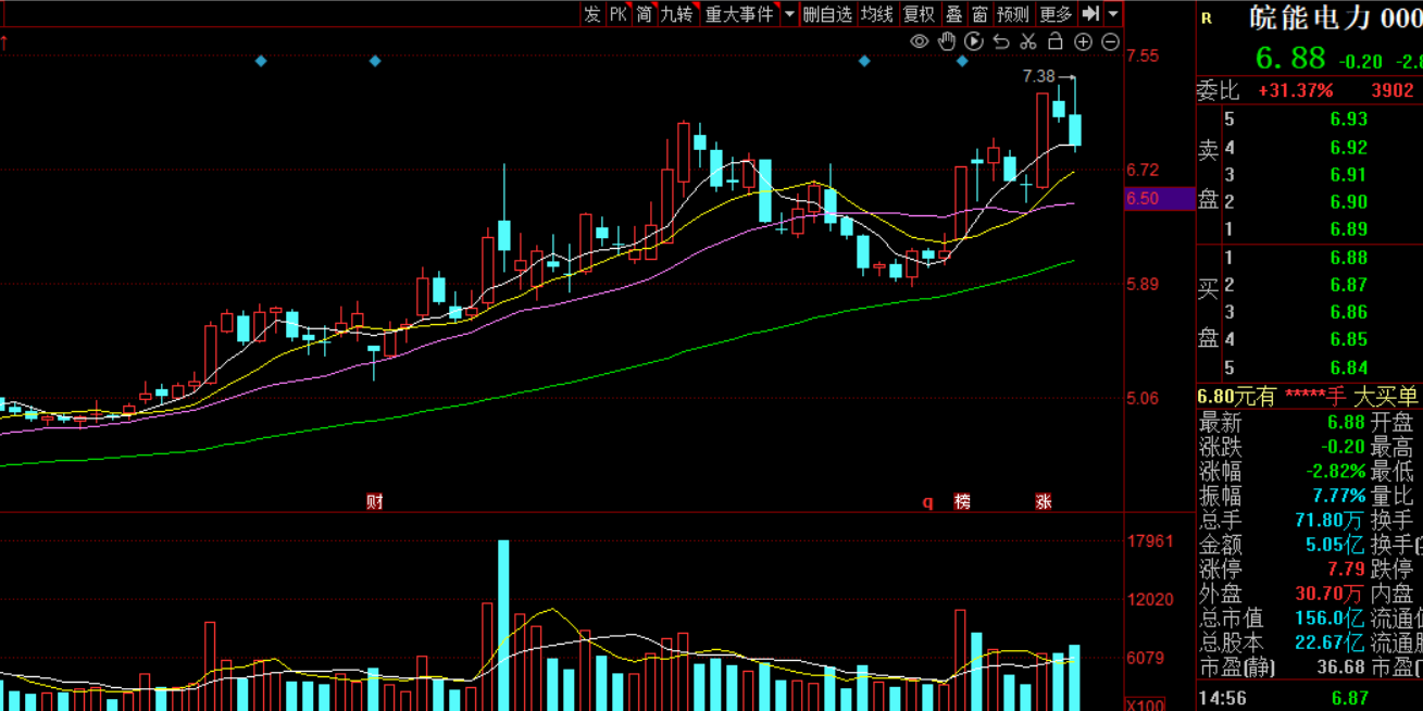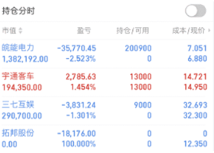 3,$皖能电力(SZ000543)$,这股老陈早盘追了一些,跌下来后又加了一些,现套2..5%,该股是近期电力股中表现最好的个股之一,有两个涨停,而且走势较稳,比广西能源(桂东电力)的走势要靠谱,后市走势估计不会差,只要电力能牛起来。基于机会的考虑,老陈还是扛一扛吧。