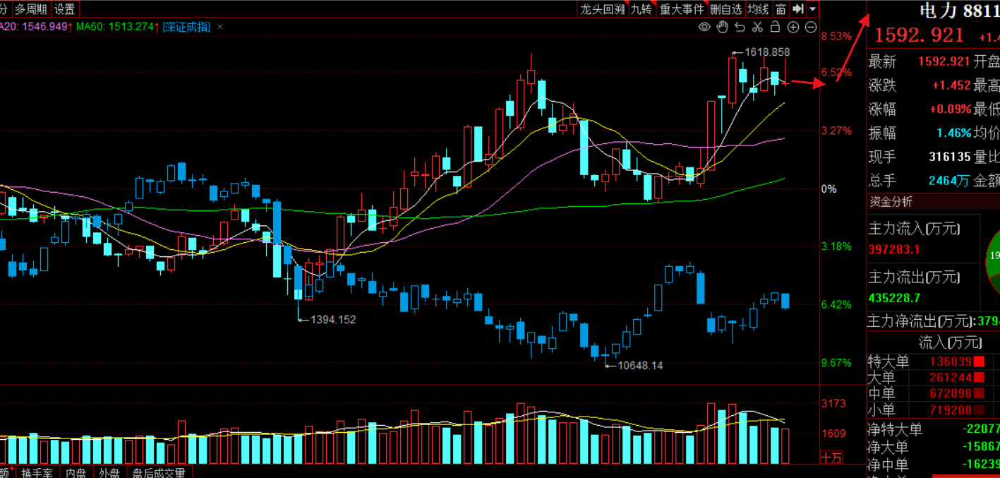 电力板块早盘放量拉升至1.37%后回落,主力的目标是让板块保持横盘的状态,不回落,以便进行突破。老陈估计电力板块短线会继续震荡横盘,不会出现明显回落,横盘目标为等上10日线然后向上进攻。