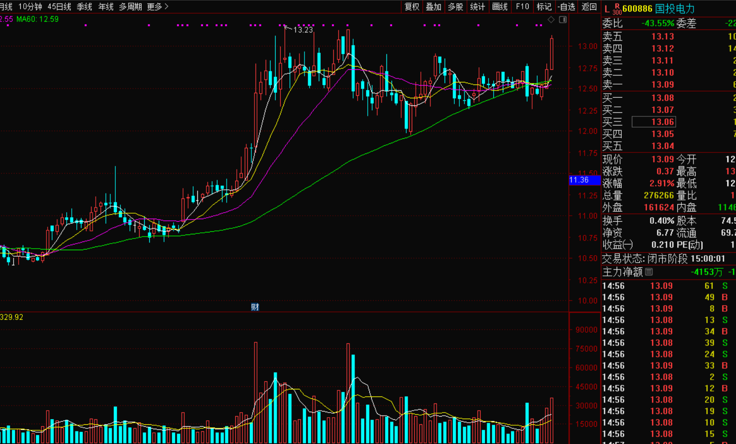 经过3个月的高位横盘,等上了60日线,所有中短期均线粘合在一起,它选择方向向上,昨天涨2.91%中阳向上突破,这次电力股触底反弹是国投电力的节奏了,明天可以重点关注。