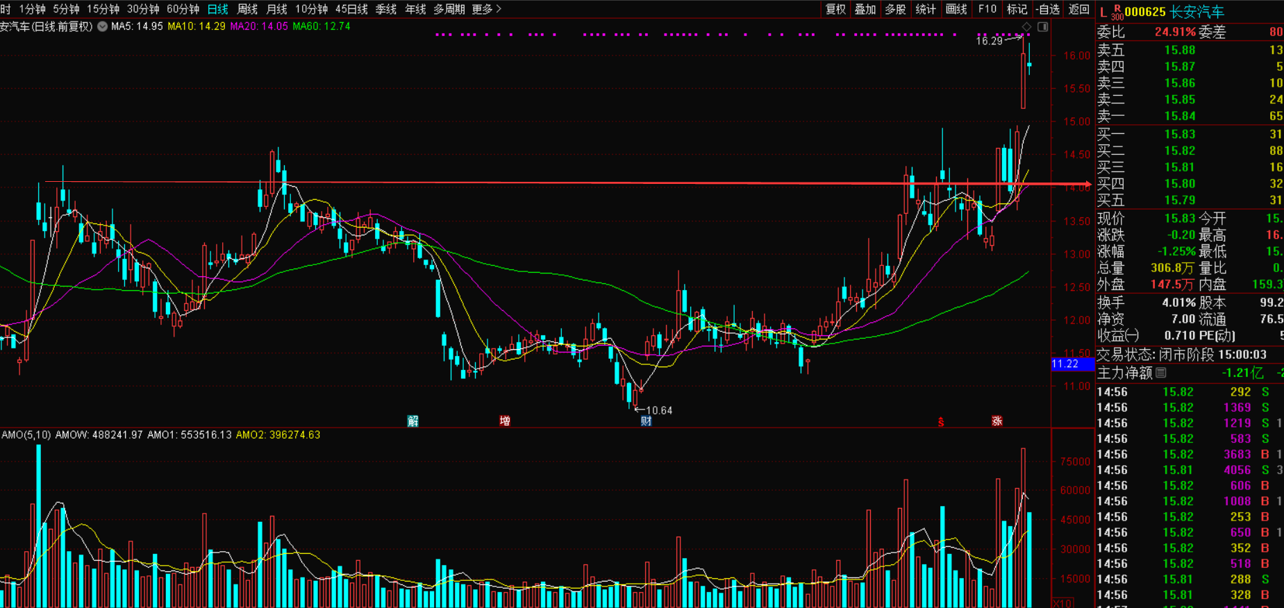 $长安汽车(SZ000625)$,最近除了权重股,汽车整车是唯一一个还能继续强势的板块,其中长安汽车是最具有操作价值的,它业绩很好,走势也很强,很可能有主升浪机会。近几天频繁出现大阳线,并突破了年内构筑的底部,连续有大阳出现,有启动大行情的迹象,周一刚刚大阳突破,突破是最应该连续大涨的时候,而且现在大盘环境也支持,昨天小星调整后,今天值得看好,盘中观察,只要开盘后走强就能上车。