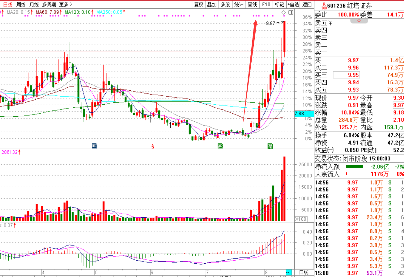 $红塔证券(SH601236)$601236:券商每个阶段的行情,都会有一个新的领涨龙头。红塔证券是昨日冲击过涨停,但是没封住,可以看做是试盘。因此在今日金融回归下,该股最先涨停,很有希望成为本次的领涨标的。红塔证券当前位置还处于低位,今日向上突破了前期的高点,上涨的趋势性行情已经启动。