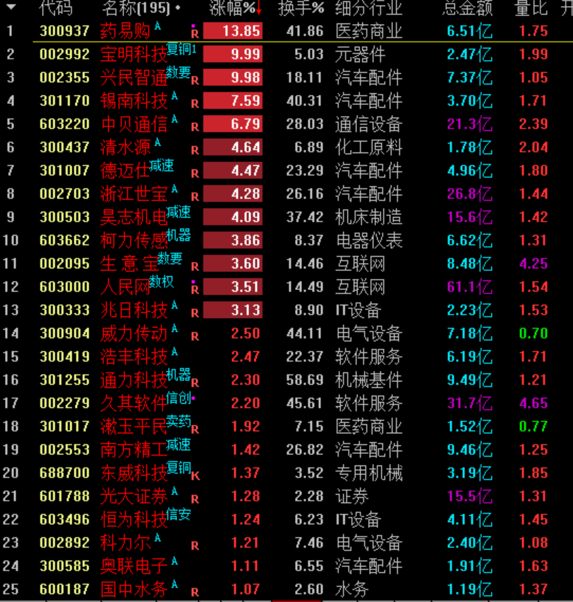 日本排放核污水事件影响盐业股、水产股、核污染防治板块,中晟高科、大湖股份、百洋股份、苏盐井神、江盐集团、嘉戎技术、中电环保涨停。目前来看大湖股份的走势最漂亮,加上同板块中涨停数比较多,后面还是可以观注一下,不过题材不够大,只能小炒一把。环保行业受带动再度升温,科净源、正和生态、绿茵生态、国泰环保等涨停,短期的话龙头启迪环境已经走得差不多了,正和生态今天也是明显出现紫金出逃,虽然封板,明天也面临较大的压力。数据要素概念依旧抢眼,零点有数、直真科技、三维天地、中国科传、新炬网络、天迈科技、兴民智通等涨停。我目前重点观注兴民智通,这个标的有机会走妖,明天如果能继续开在2个点左右,同时量能跟今天的差不多就行。可以重点观注。