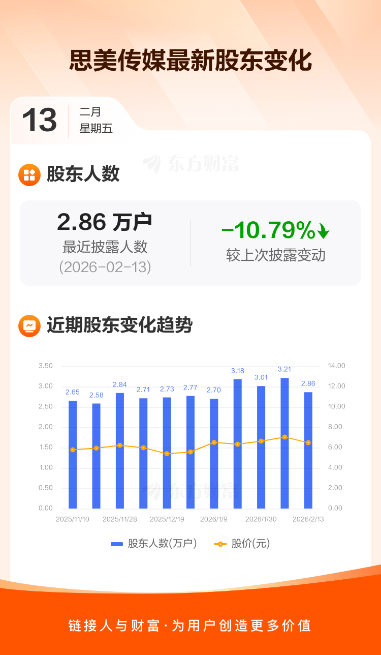 思美传媒最新披露数据显示,截至2月13日公司股东户数为2.86万户,较上期(2026年2月10日)减少3461户,降幅为10.79%。户均持有流通股数量由上期的1.69万股上升至1.89万股,户均持股金额由上期的11.85万元增加至12.22万元。