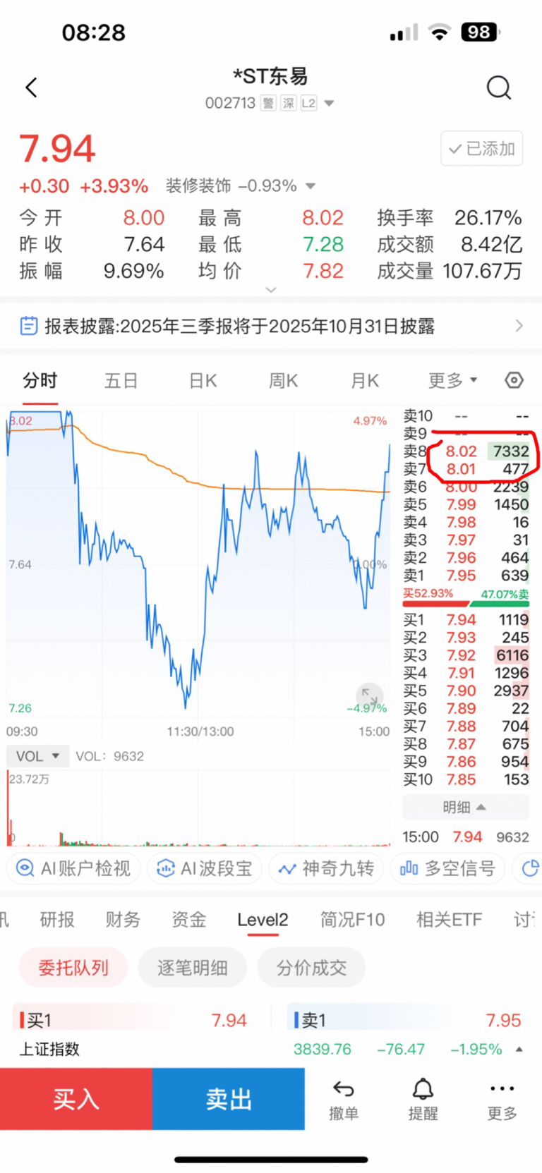 $*ST东易(SZ002713)$ 东易的多头真的太强了!尾盘新主力一直扫货吃筹码,涨停板价格的压单就剩下几千手,如果再给一分钱时间的话,东易肯定是涨停板收盘,非常强势的天地天涨停板!东易有妥妥的龙头老大气势!欢迎周五的新主力进场打造东易成为ST板块总龙头