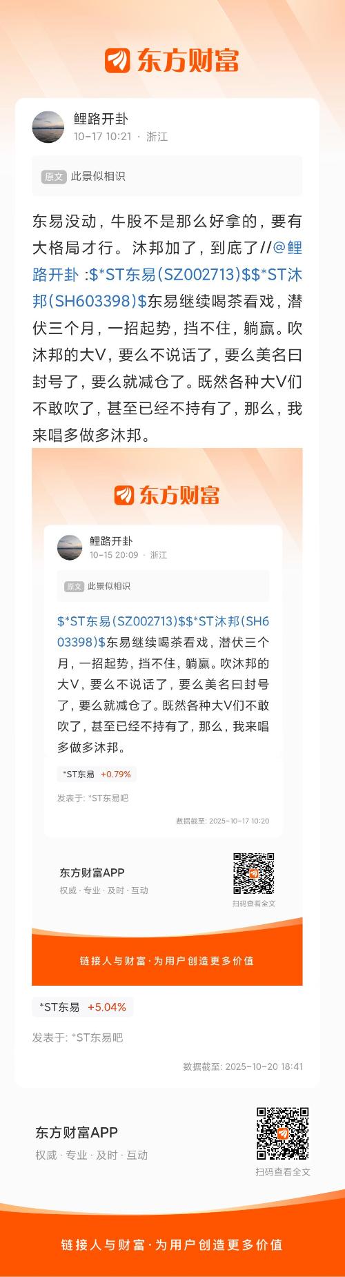 在逻辑面前,谈技术都是徒劳的。没有逻辑支撑,没有强大的心态,吃不了两菜的//@鲤路开卦 :东易没动,牛股不是那么好拿的,要有大格局才行。沐邦加了,到底了//@鲤路开卦 :$*ST东易(SZ002713)$$*ST沐邦(SH603398)$东易继续喝茶看戏,潜伏三个月,一招起势,挡不住,躺赢。吹沐邦的大V,要么不说话了,要么美名曰封号了,要么就减仓了。既然各种大V们不敢吹了,甚至已经不持有了,那么,我来唱多做多沐邦。
