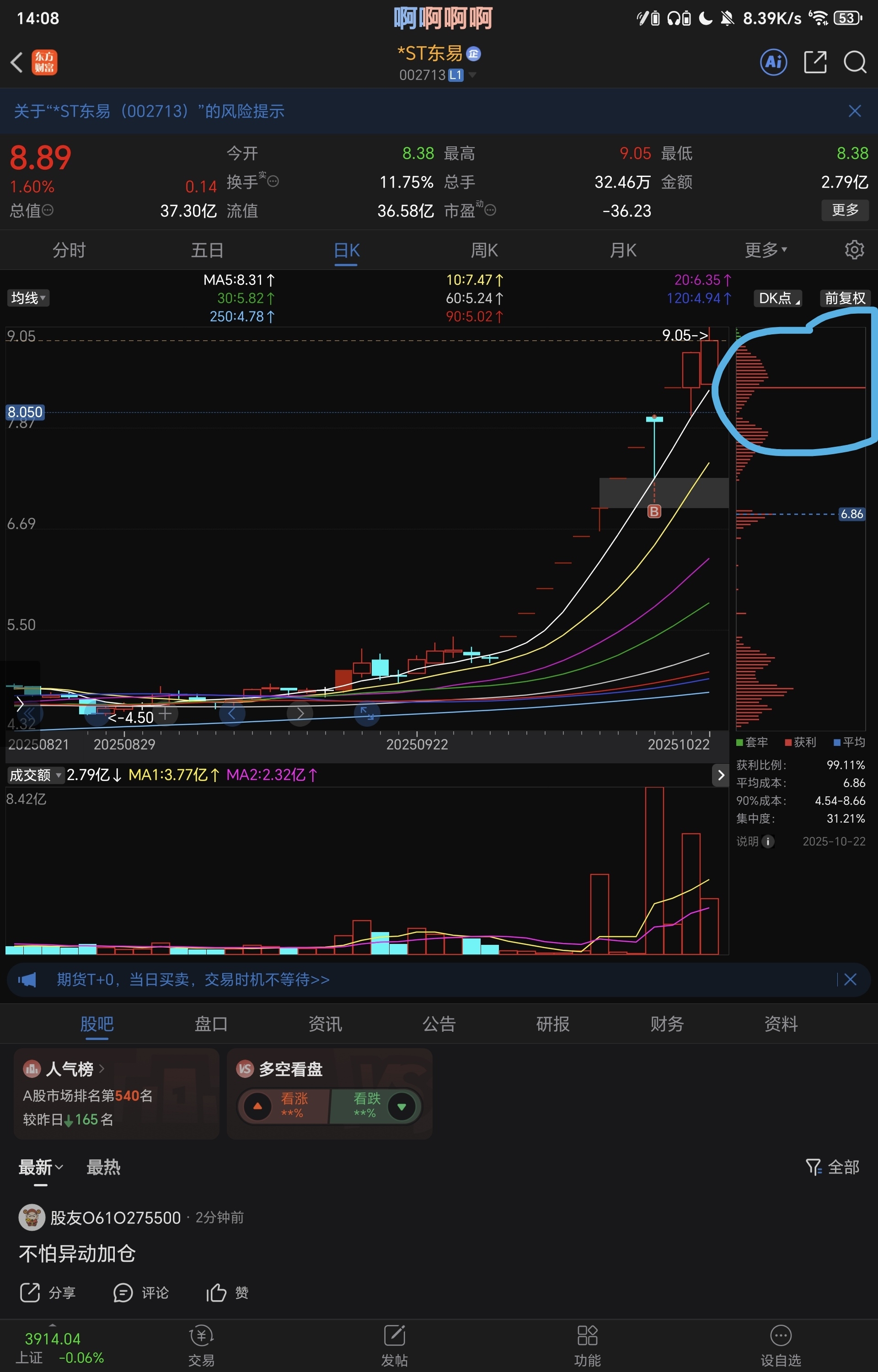 $*ST东易(SZ002713)$ 筹码分布巨量柱,今天开盘将近跌停开把很多小散的筹码都给吓出来了,主力照单全收,主力都愿意收我还怕集贸啊,坚定持有坐等主力和散户帮我抬轿