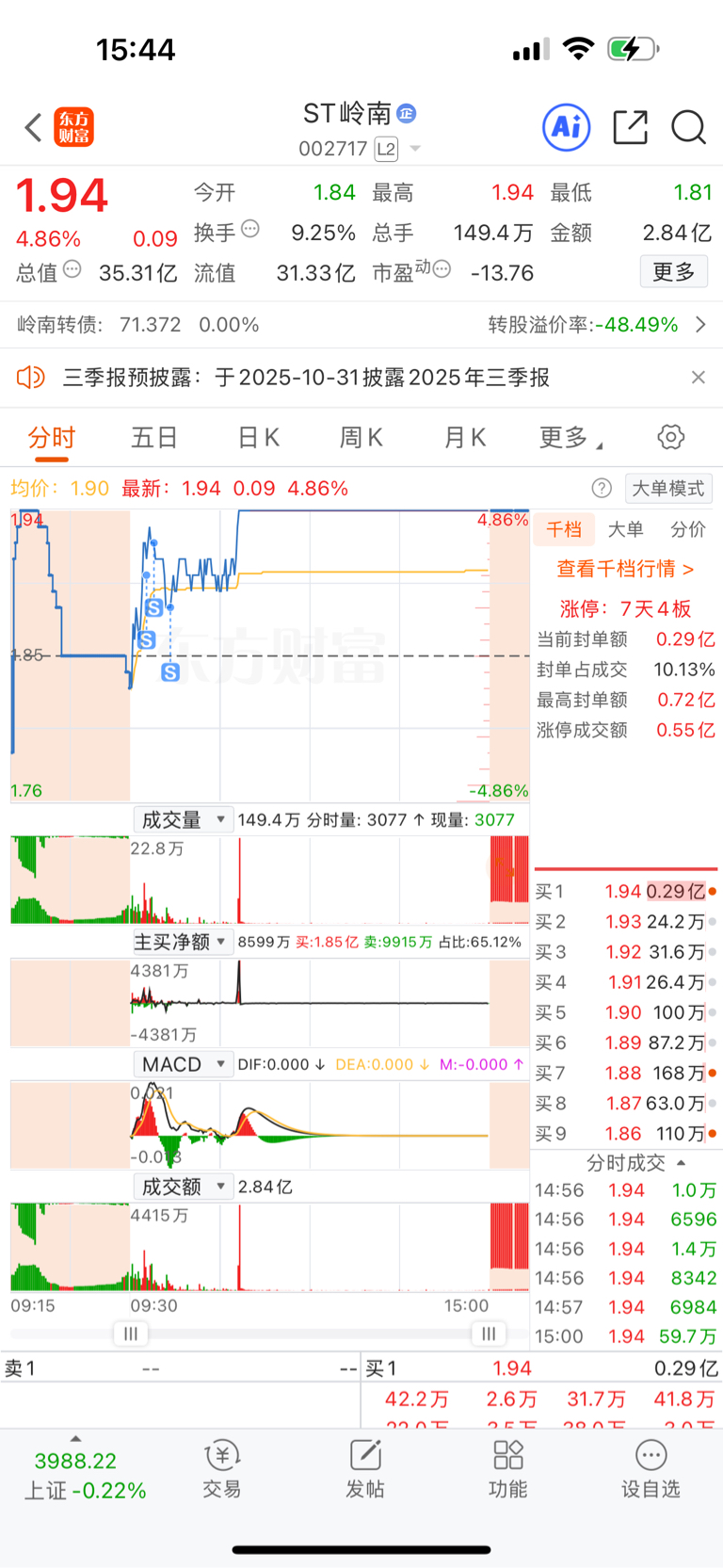 岭南没拿住。工业富联买完开涨。华通苏吴直接两个跌停板不知道什么时候出来。看东易不