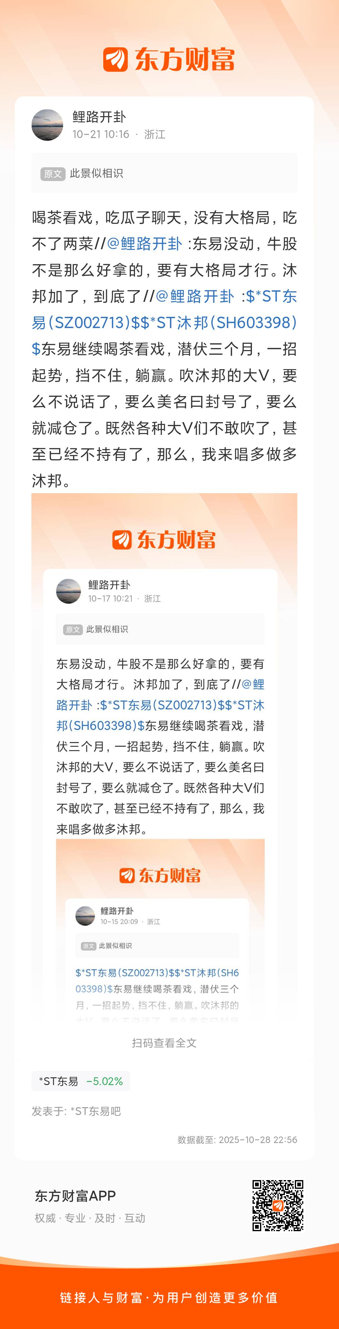 //@鲤路开卦 :喝茶看戏,吃瓜子聊天,没有大格局,吃不了两菜//@鲤路开卦 :东易没动,牛股不是那么好拿的,要有大格局才行。沐邦加了,到底了//@鲤路开卦 :$*ST东易(SZ002713)$$*ST沐邦(SH603398)$东易继续喝茶看戏,潜伏三个月,一招起势,挡不住,躺赢。吹沐邦的大V,要么不说话了,要么美名曰封号了,要么就减仓了。既然各种大V们不敢吹了,甚至已经不持有了,那么,我来唱多做多沐邦。