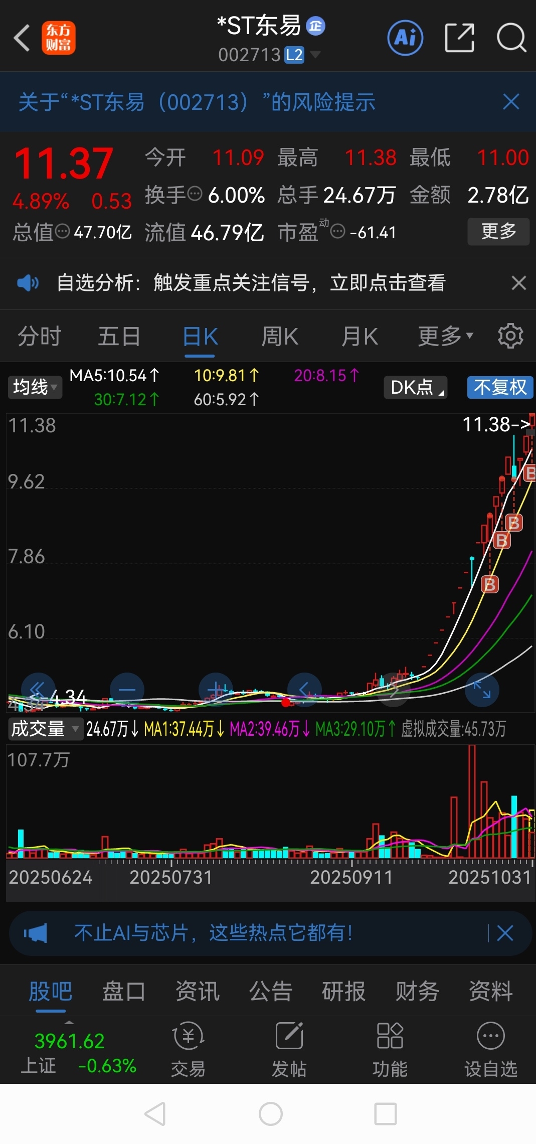 $*ST东易(SZ002713)$ 只B不踢,买了就锁仓,宇顺为什么那么牛,就是都锁仓了,随着股价上涨,看起来盘子变大了,实际上筹码变少了,涨起来就容易。