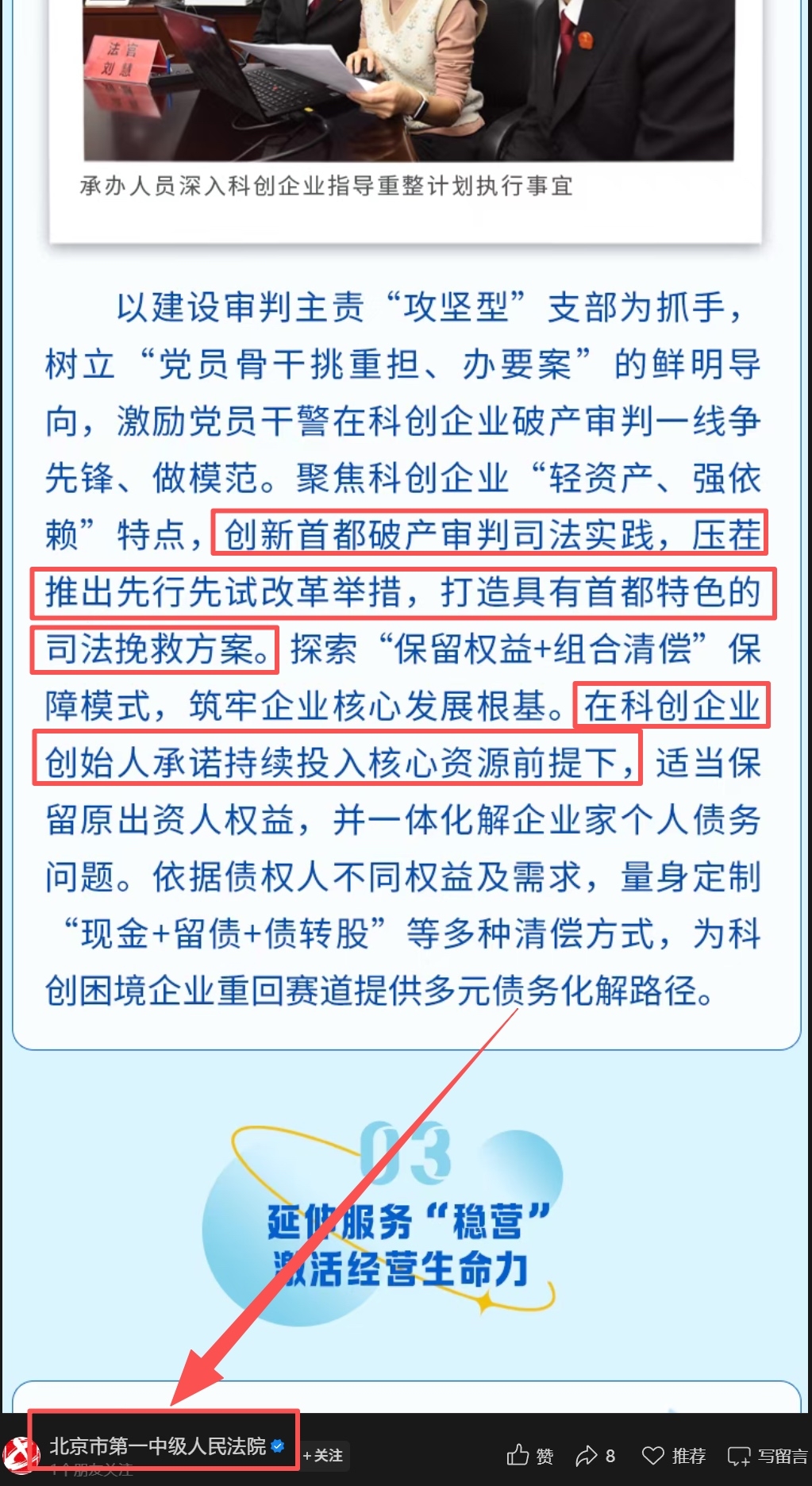 11月1号,北京一中院发布了一条官微,这条官微里的几句话,我读完之后,瞬间想到这不就说的是东易!就差点名了!!!就是明确在树标杆,在定范例!A股史上最优秀的重整方案!非常值得期待!